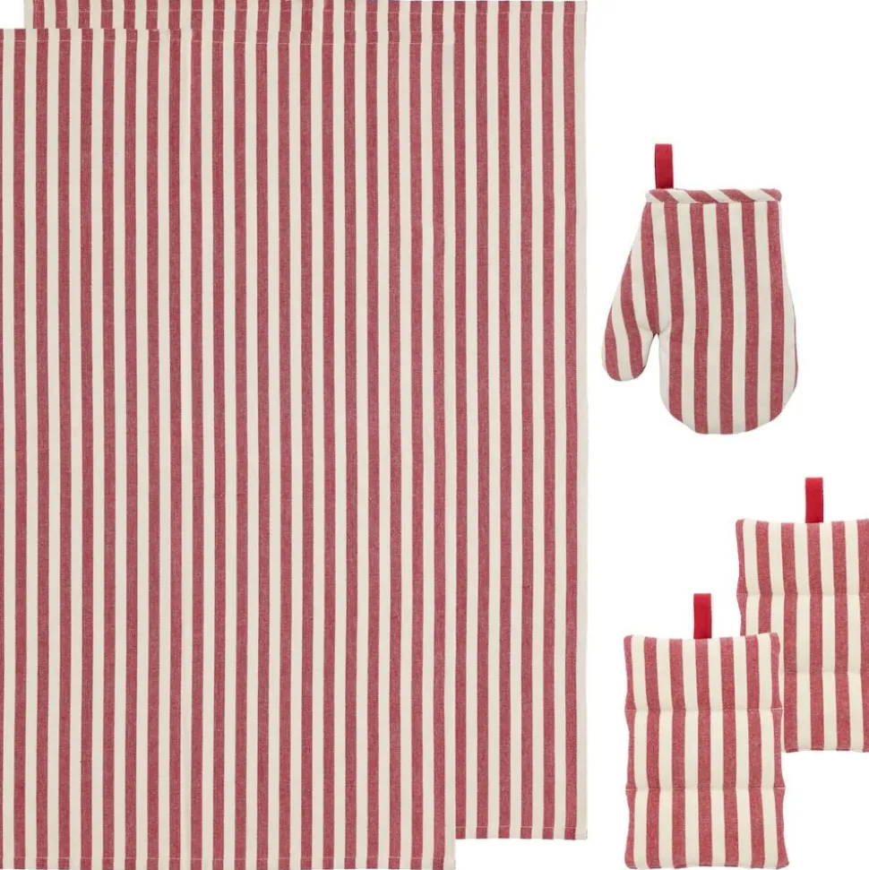 Tekstilsættet i 5 dele i genanvendt bomuld består af 2 viskestykker 50 x 70 cm, miniovnhandske 14 x 21 cm og 2 grydelapper 20 x 20 cm. Red.