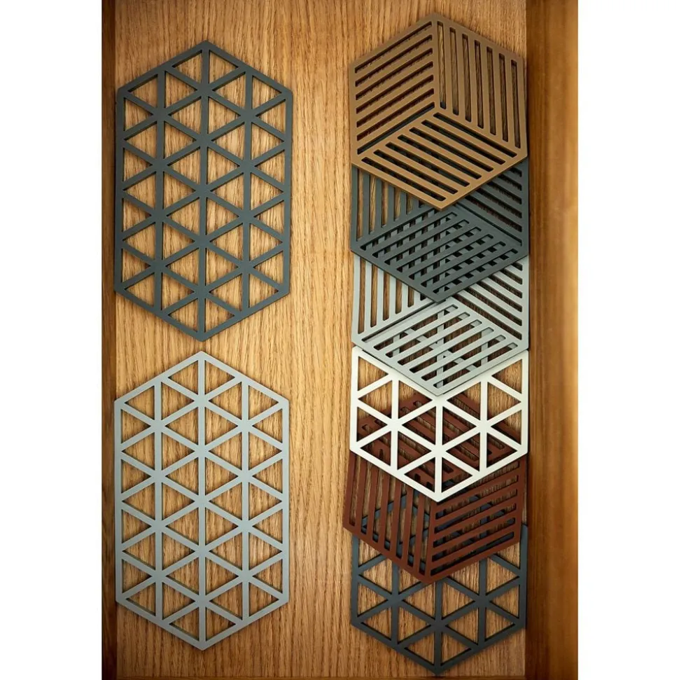 Hexagon bordskånerne i silikone er så grafisk dekorative, at de indbyder til at lægge en flok ud i hele bordets længde uden at stille noget på dem. De er varmebestandige op til 250 °C og kan vaskes i opvaskemaskine. 16 x 14 x 0,9 cm.
