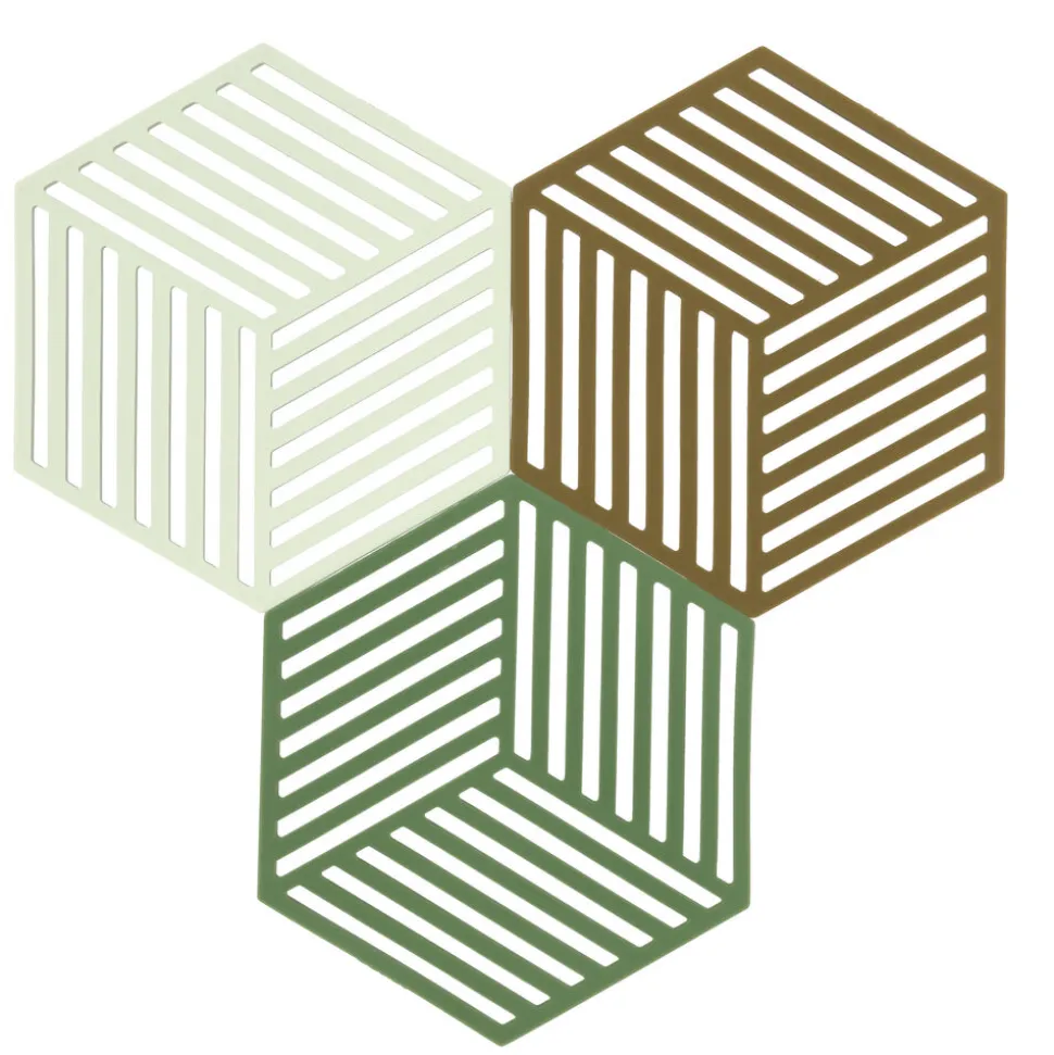 Hexagon bordskånerne i silikone er så grafisk dekorative, at de indbyder til at lægge en flok ud i hele bordets længde uden at stille noget på dem. De er varmebestandige op til 250 °C og kan vaskes i opvaskemaskine. 16 x 14 x 0,9 cm.
