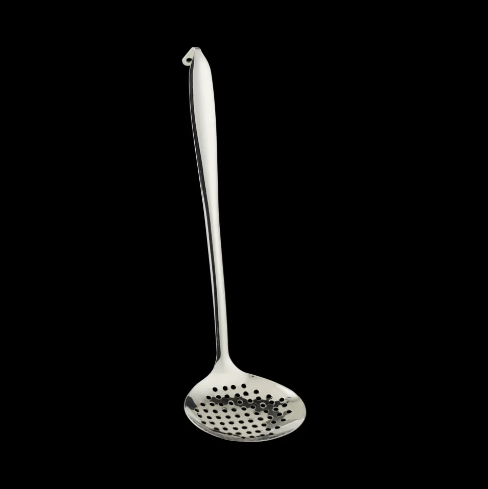 Hulske i stål som gør det let at skimme uønskede emner fra eksempelvis suppe.