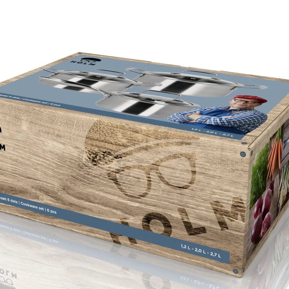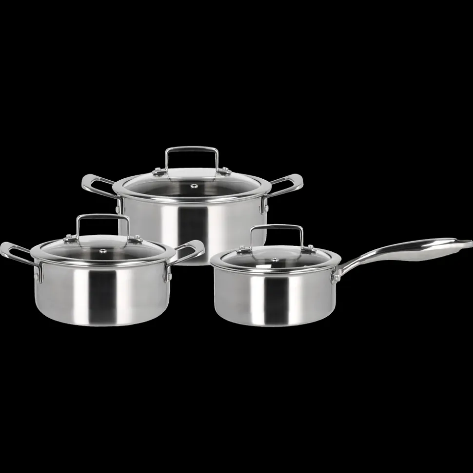 Grydesættet indeholder en kasserolle på 1,2 liter samt gryder på 2 og 2,7 liter, alle med låg.