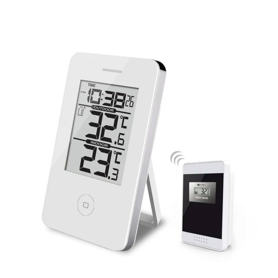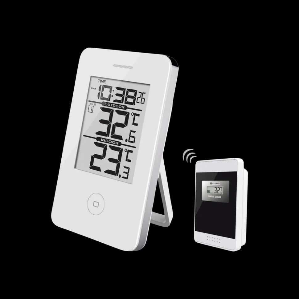 Trådløs inde/ude termometer med ur i flot hvidt design med stort display.