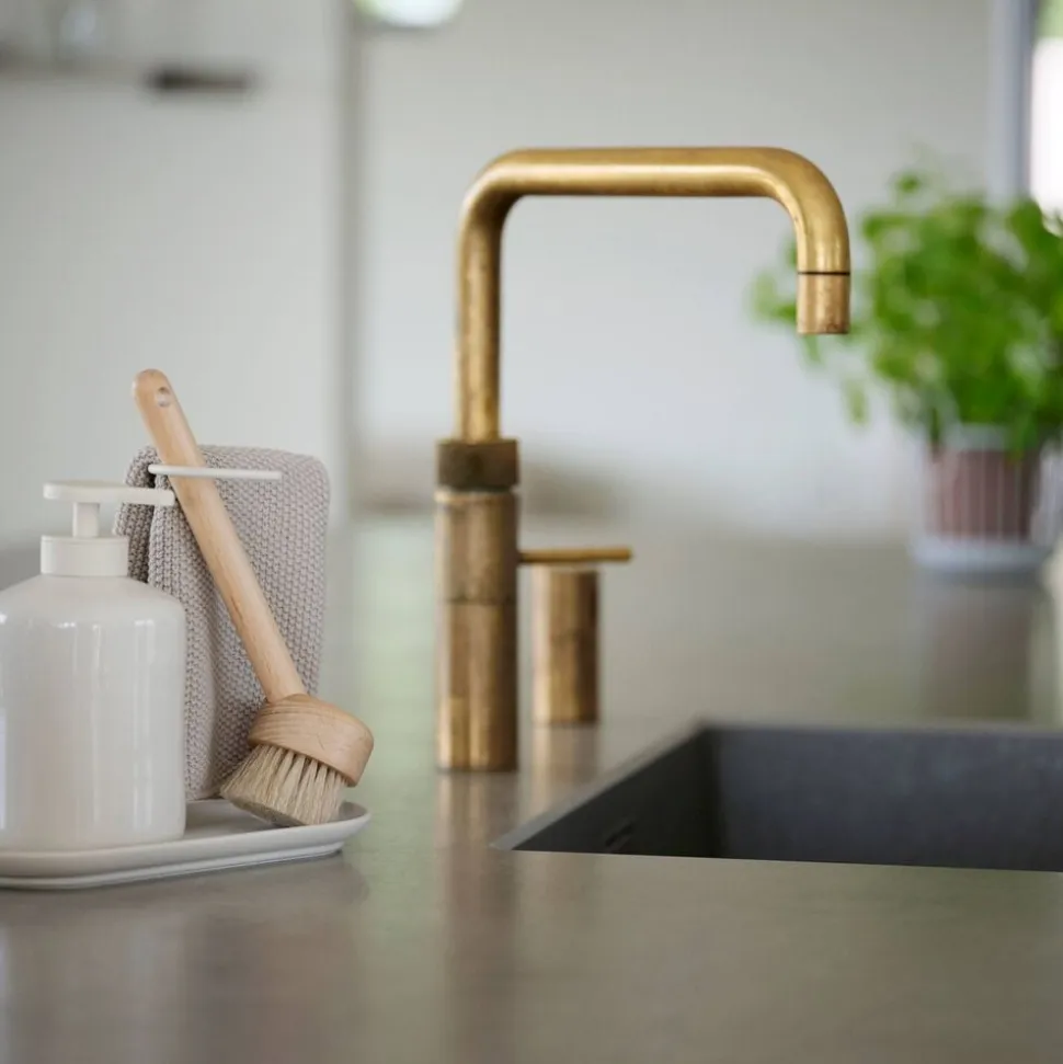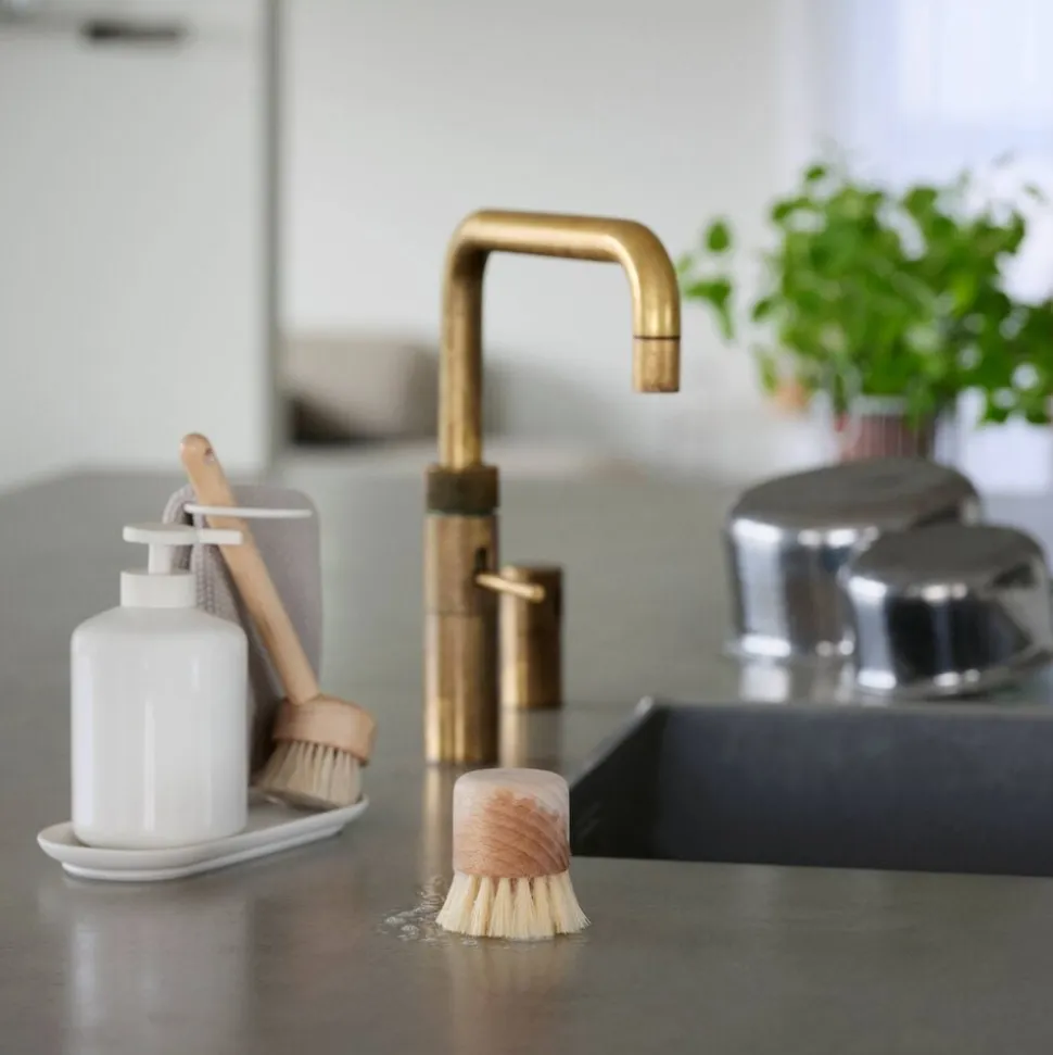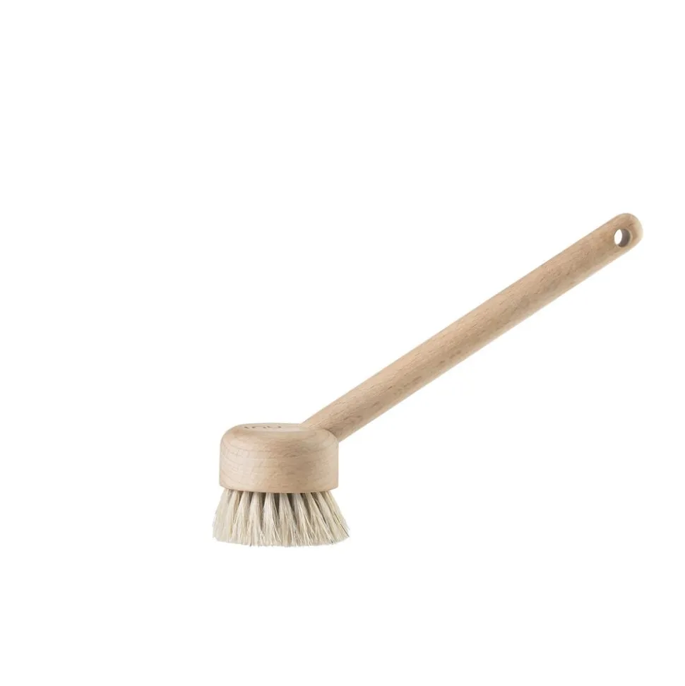Inu opvaskebørsten er udført i bøg og behandlet med bivoks. Sammen med det runde skaft sikrer bivoksen et blødt og behageligt greb. Vinklen mellem hoved og skaft er helt perfekt. Det kan du mærke allerede ved første kop. Et rundt hul i enden af skaftet gør det muligt at sætte en strop i, hvis du foretrækker, at børsten hænger. Den smukke organiske form og materialevalget går igen i både grøntsagsbørste og grydebørste i samme serie.