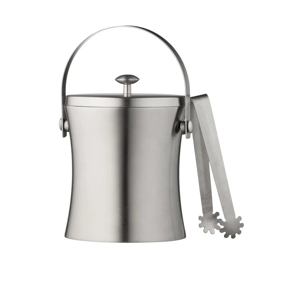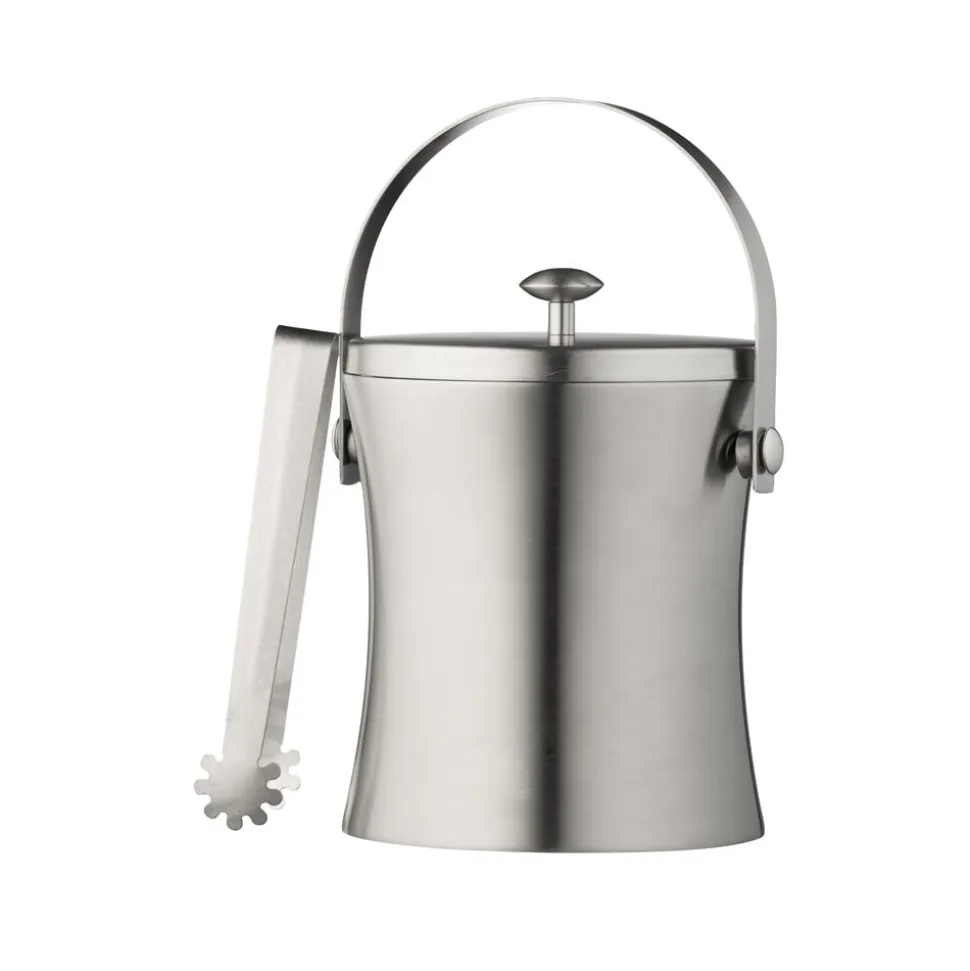 Funktionel isspand i blankpoleret rustfrit stål, med hank og integreret tang. Isspandens dobbeltvæg holder isterninger kolde, mens den aftagelige rist adskiller isterningerne fra det smeltede vand.
