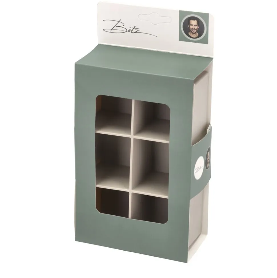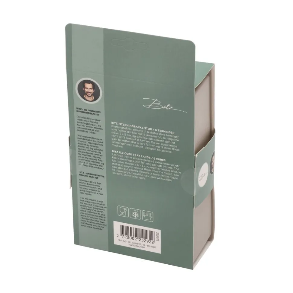 Isterningbakke i silikone til 6 ekstra store terninger, som holder drinken kold i længere tid. Terningerne måler 5 x 5 cm, og den fleksible silikone gør det nemt at få dem ud af formen. Velegnet til opvaskemaskine.