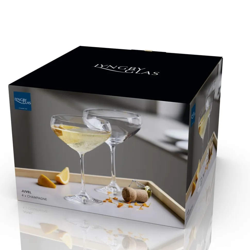 4 stk. Juvel champagneskål, 34 cl. Den høje stilk giver champagneskålen et smukt og stilfuldt udtryk, og det tidløse design gør det til et klassisk glas. Takket være dets alsidighed passer glasset til enhver borddækning. Det kan bruges både som champagneskål, cocktailglas og til portionsanretning af forretter og desserter. H 16,5 cm.