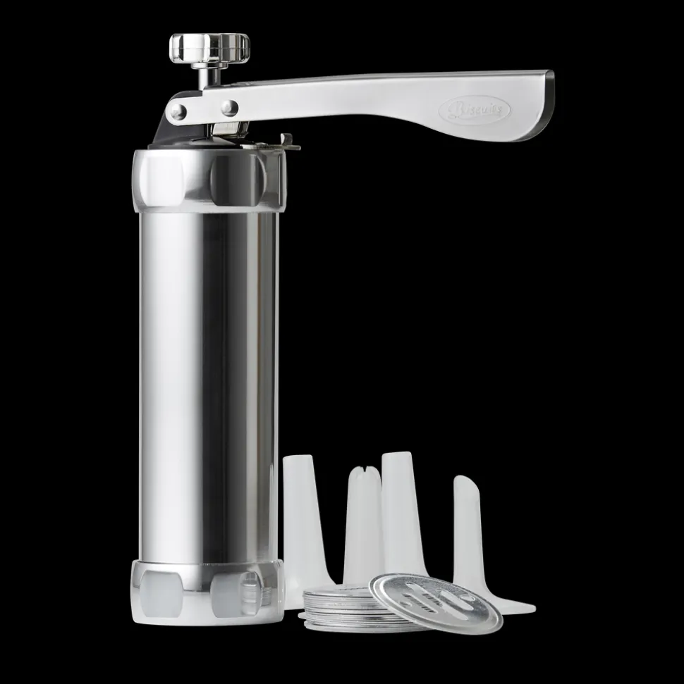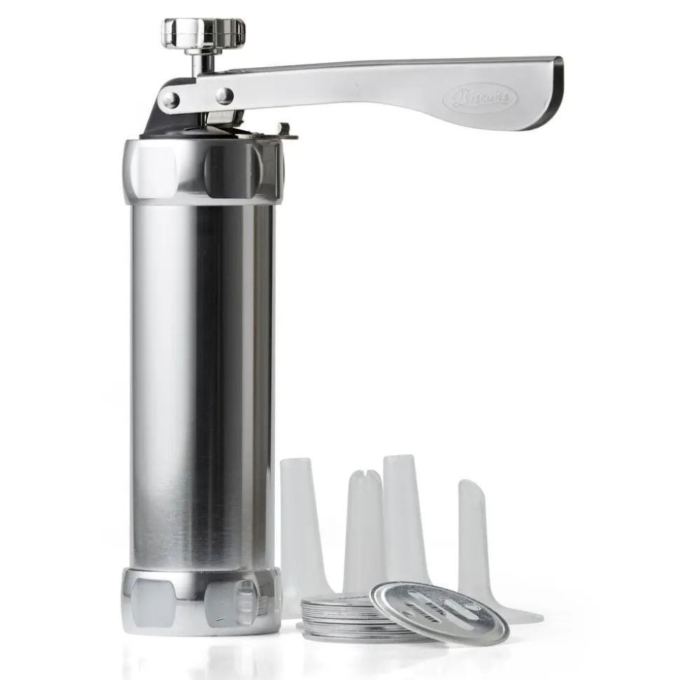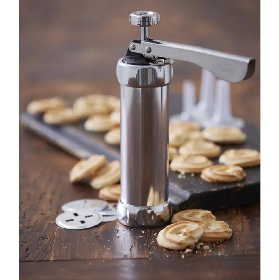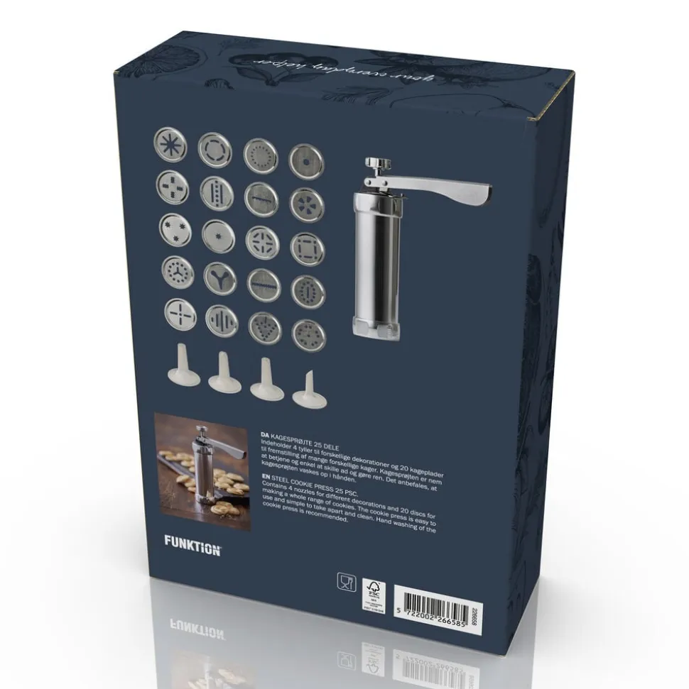 Kagesprøjte i stål. Indeholder 4 tyller til forskellige dekorationer og 20 kageplader til fremstilling af mange forskellige kager. Kagesprøjten er nem at betjene og enkel at skille ad og gøre ren. Det anbefales, at kagesprøjten vaskes op i hånden.