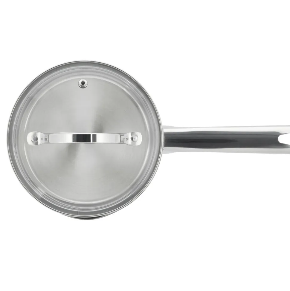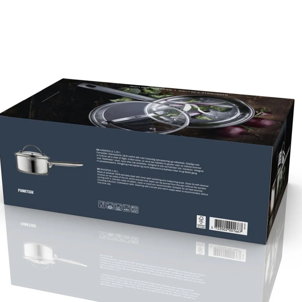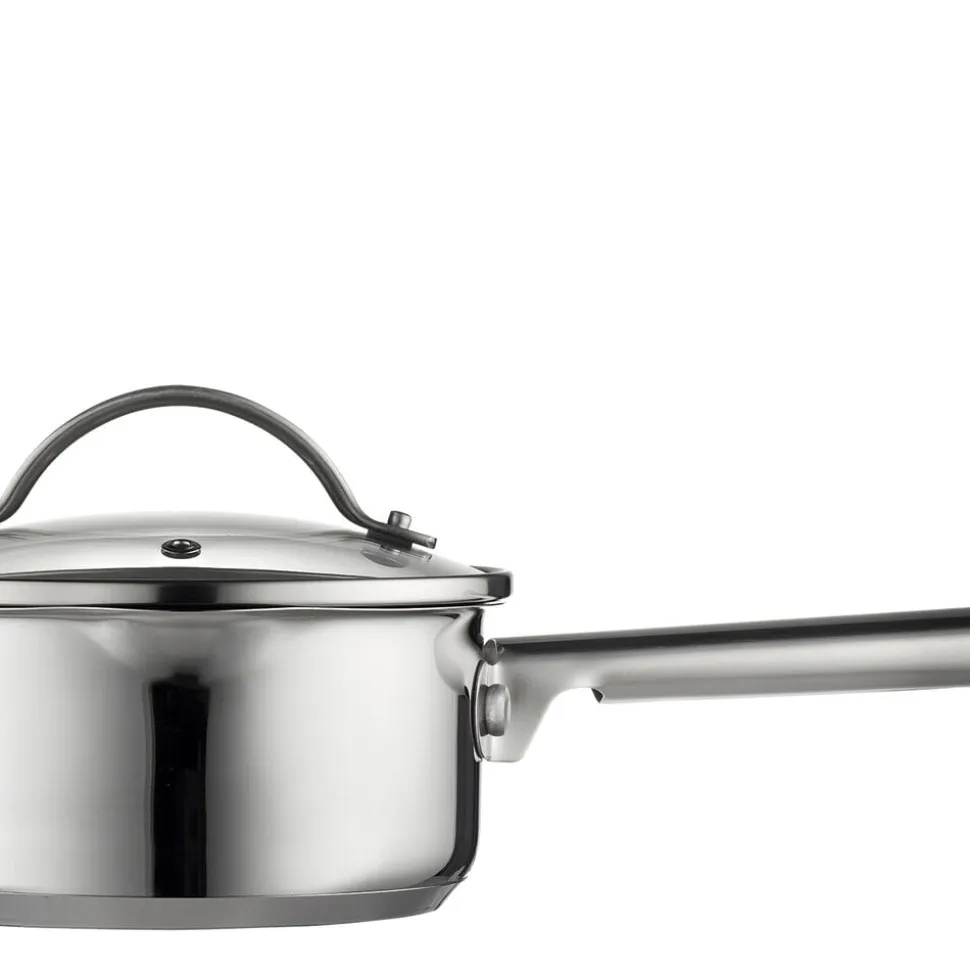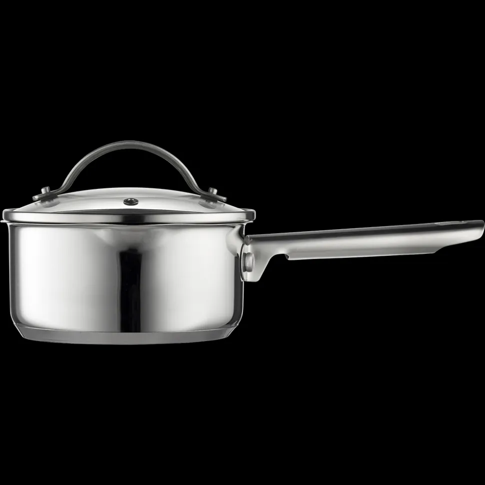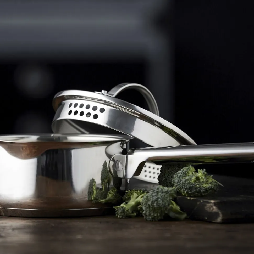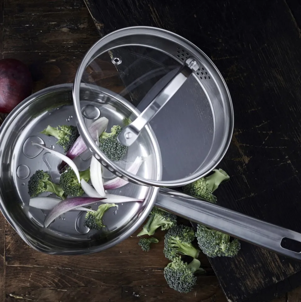 Glaslåg med si-funktion på to sider af låget, hvilket sikrer, at vand kan hældes fra gryden uden at indhold kommer med.