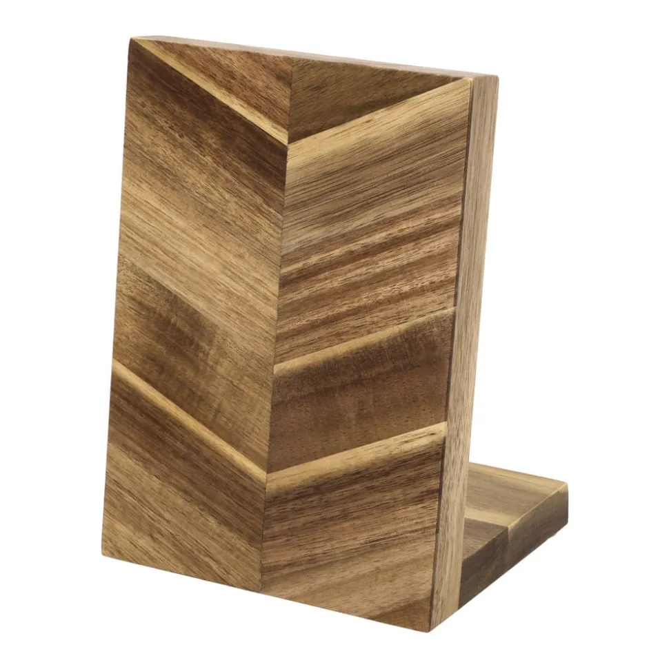 Smuk magnetisk knivblok i akacietræ i sildebensmønster. Den tunge fod sikrer, at blokken står solidt og sikkert på bordet. Knivblokken har dobbelt opbevaringsplads, idet knivene kan placeres på begge sider af blokken.