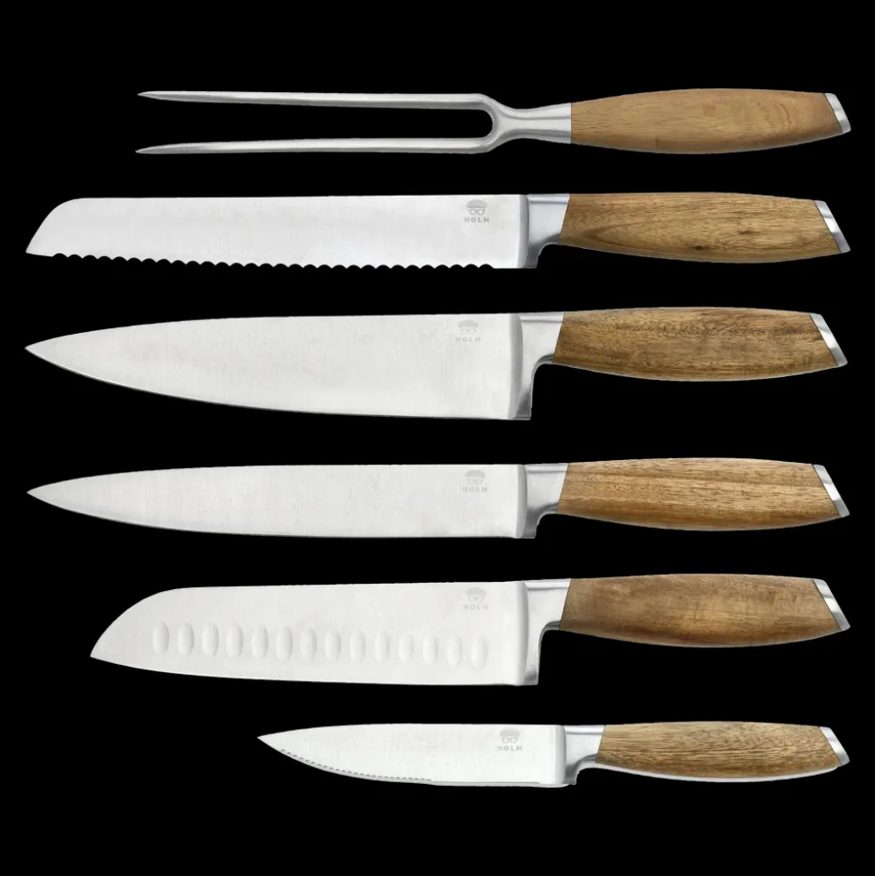 Knivsættet indeholder fem lækre knive – universalkniv 24 cm, santokukniv 31 cm, filetkniv 33 cm, kokkekniv 33 cm, brødkniv 33 cm – og en stegegaffel 29 cm. De flot rundede skafter, der ligger behageligt i hånden, er af akacietræ med virkeligt smukke og karakteristiske åretegninger og er afsluttet med en elegant stålkappe for enden af skaftet. Bladene er af rustfrit stål i høj kvalitet. Knivene skal vaskes i hånden med varmt vand og sæbe, også før første brug.