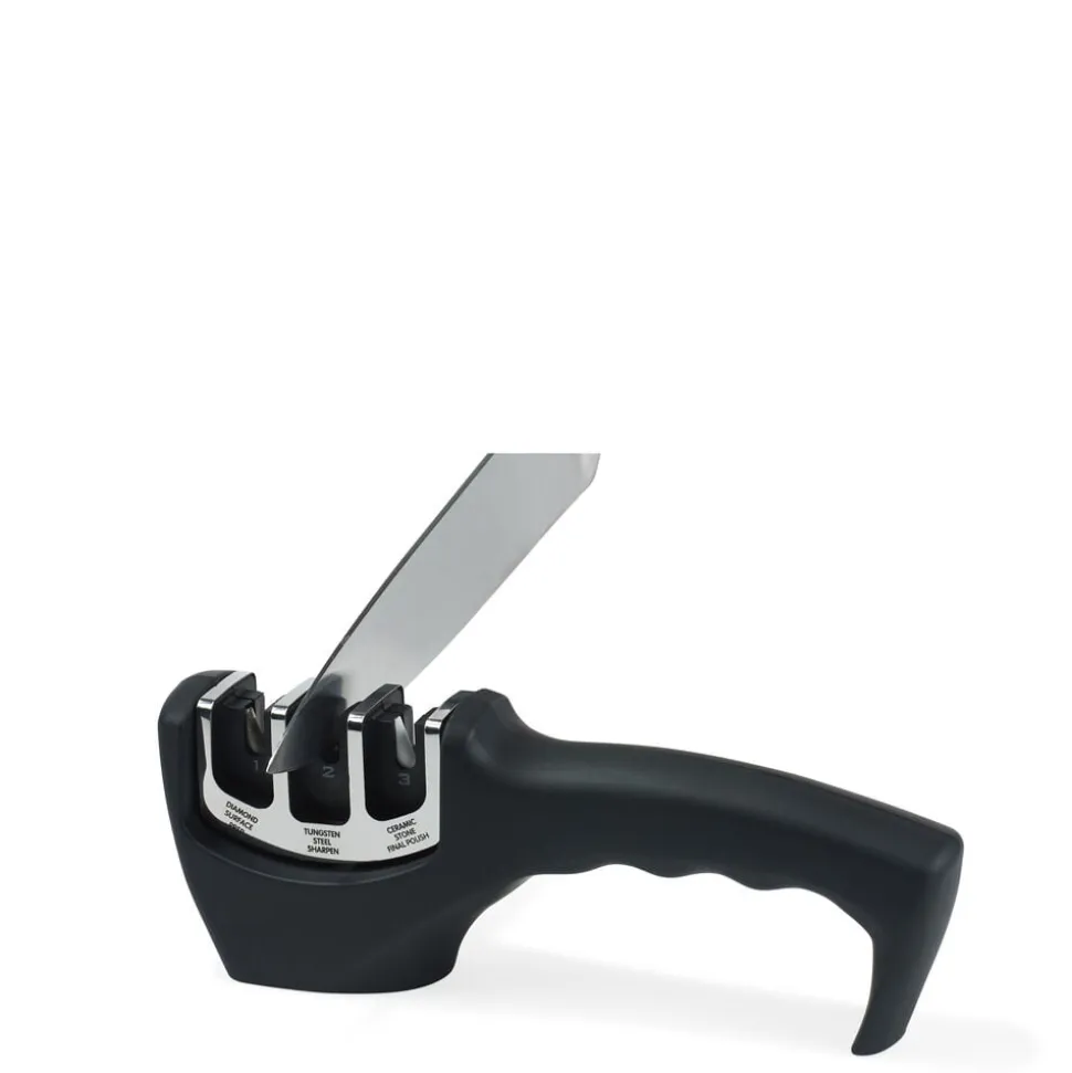 En knivsliber er uundværlig i køkkenet og nem at bruge. Den genopretter og sliber hurtigt dine knive i tre nemme trin. Denne sliber har et ergonomisk greb, der giver et godt, stabilt greb under slibning. Anti-slip områder under bunden sikrer at sliberen ikke skrider på bordet.