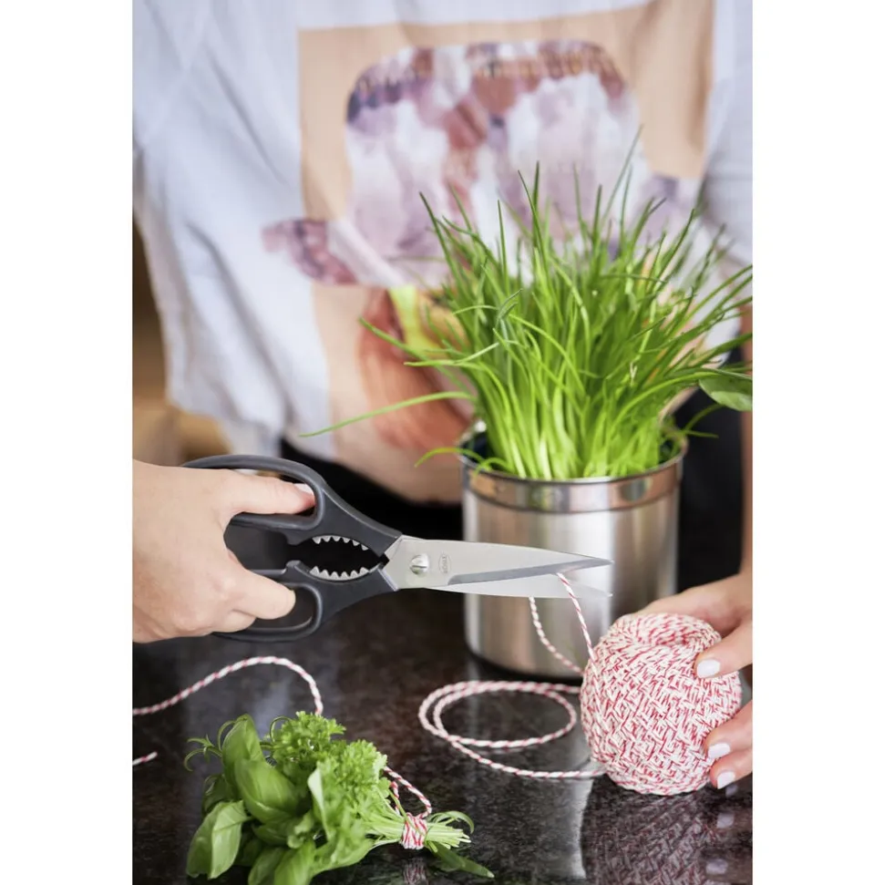 Saks i hærdet rustfrit stål med mikro-savtakkede blade, der sikrer en præcis klipning. Perfekt til brug på et stort udvalg af materialer i køkkenet. Klipper meget nemt, også tyndt folie og klude. Det fleksible plasthåndtag ligger komfortabelt i hånden. Saksen kan nemt skilles ad ved rengøring. Velegnet til venstrehåndede. Ikke egnet til opvaskemaskine.