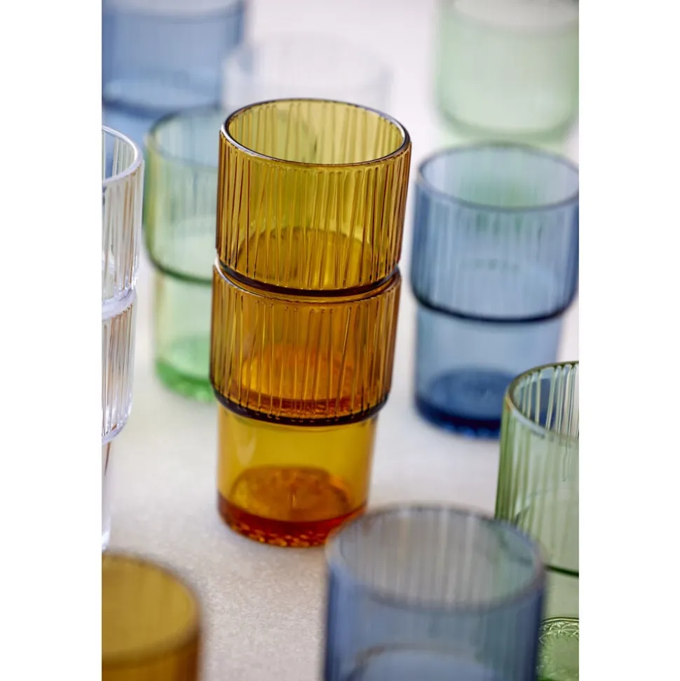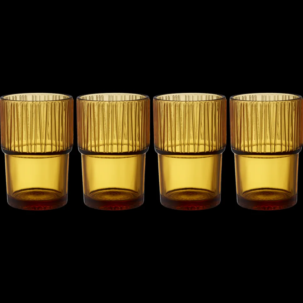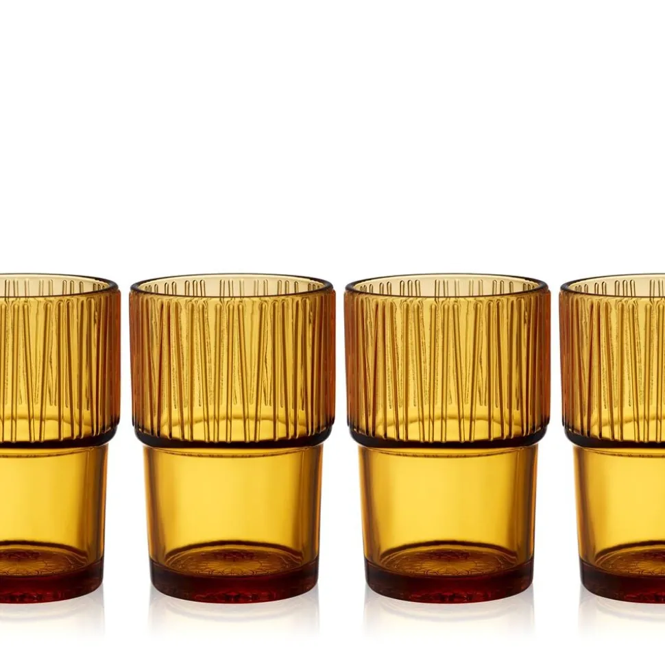 4 stabelbare caféglas, 38 cl, i gennemfarvet glas til både kolde og varme drikke. Nyd caffe latte, te, chai latte, varm kakao og meget andet af de smukke og solide glas, der gør hverdagen lidt skønnere. Velegnet til opvaskemaskine. Når du køber fra Kusintha-kollektionen, støtter du udsatte børn i verdens fattigste områder.