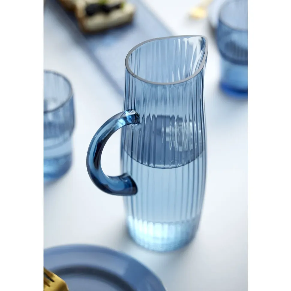 Nyd synet af den fine kande i riflet, gennemfarvet glas, når du hælder vand eller juice op. Kanden fås i farverne grøn, amber, pink, blå og i en helt klar udgave, og når du køber fra Kusintha-kollektionen, støtter du samtidig udsatte børn i verdens fattigste områder.