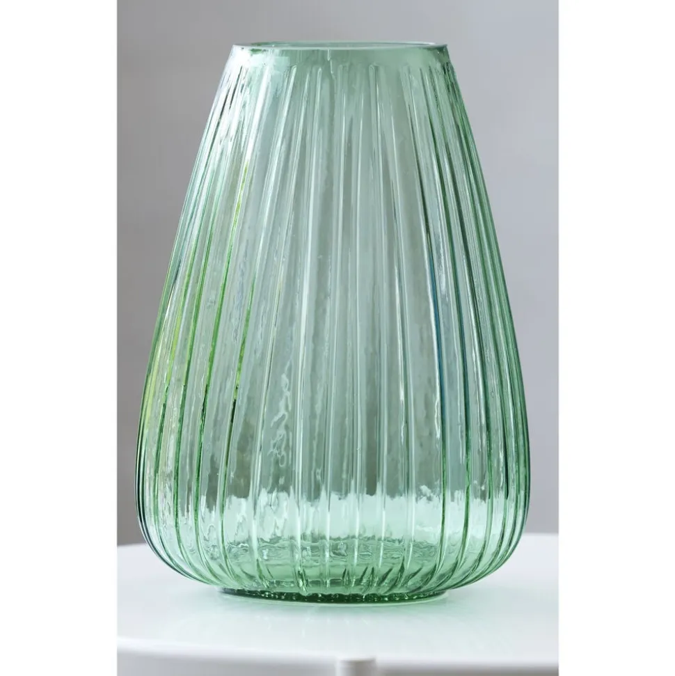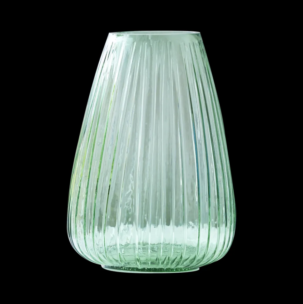 Den flotte vase i gennemfarvet glas har det samme fine, riflede look som Kusintha-seriens vandglas- og flasker. Vasen fås i grøn, amber, pink, blå og smoke. Når du køber fra Kusintha-kollektionen, støtter du samtidig udsatte børn i verdens fattigste områder. 22 cm høj.