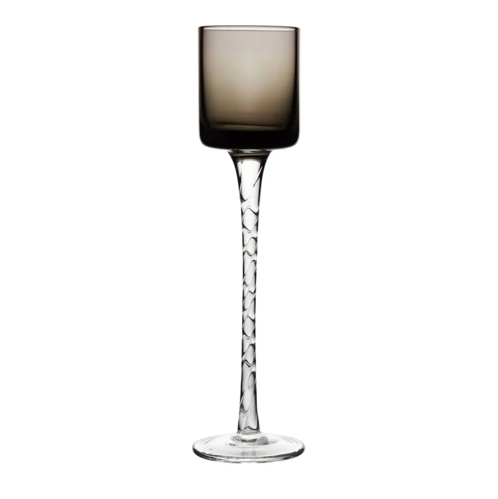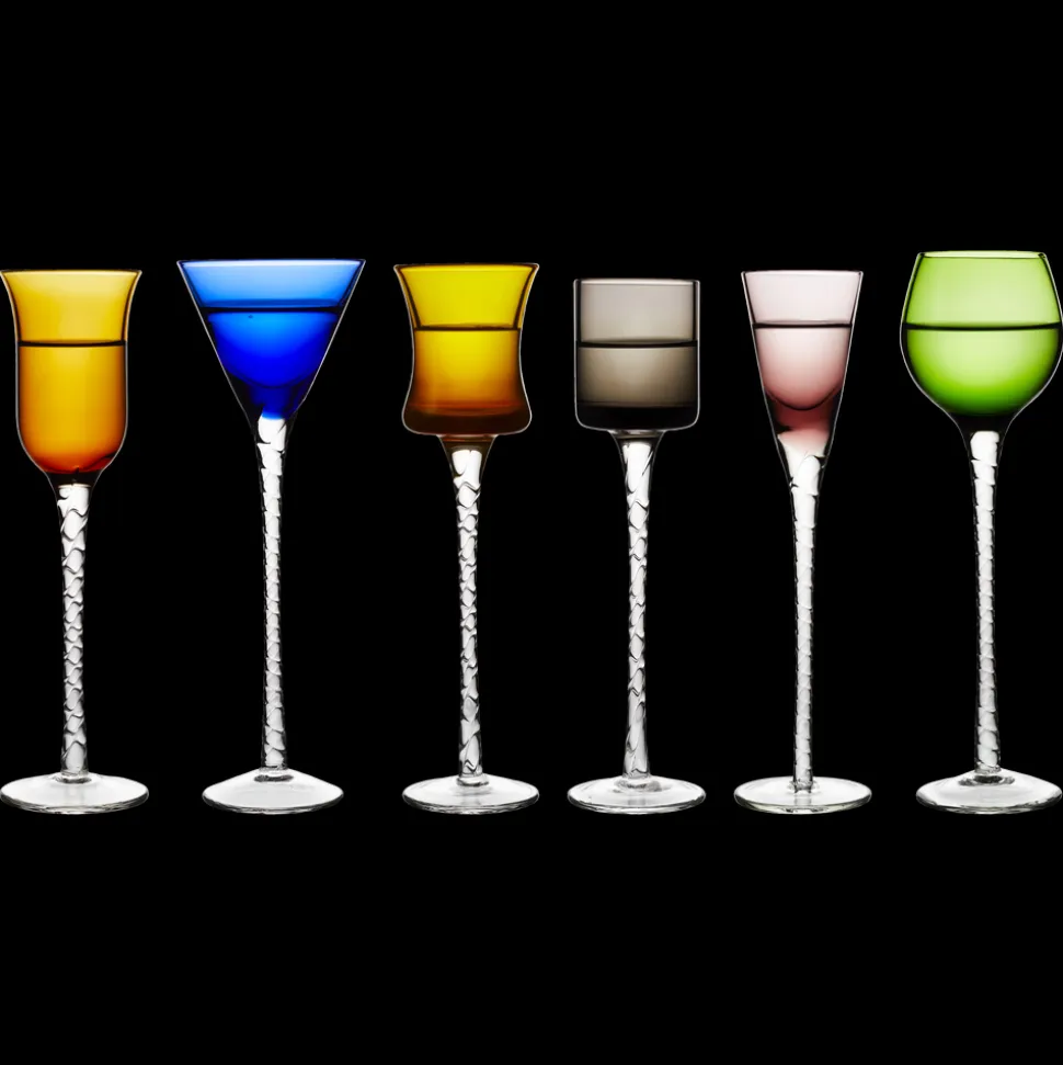 6 forskellige gennemfarvede, mundblæste snapseglas med snoet stilk bidrager til en god stemning ved bordet, og det er nemt at finde sit eget glas. Snapseglassene har forskellige udformninger i farverne lilla, blå, smoke, amber, grøn og gul og indeholder fra 2,5 op til 5 cl. H 18 cm.