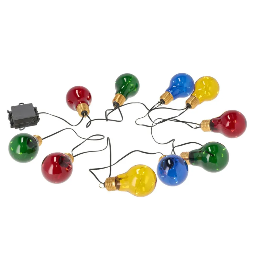 Sæt kulør på festen, så alle kan se, at der er noget at fejre. Den 3,2 m lange lyskæde har 10 farverige pærer i glas, der hver måler 6 x 10,5 cm. Pærerne lyser i farverne rød, grøn, blå og gul, og mellem hver pære er der en afstand på 30 cm. Afstanden mellem batteriboksen og den første pære er 50 cm. Tænd for lyset med 3 x AA batterier (ikke inkluderet), og hæng kæden op indendørs for særlig festlig belysning.