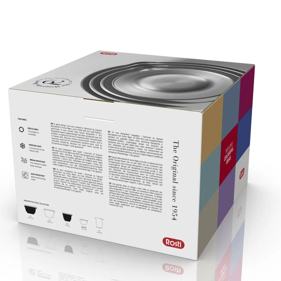 Margrethe-skålen er designet for Rosti af Sigvard Bernadotte og Acton Bjørns tegnestue i København og i 1954 med kongehusets tilladelse opkaldt efter dronning Margrethe 2. Fås også i plast i et væld af flotte farver og forskellige størrelser.