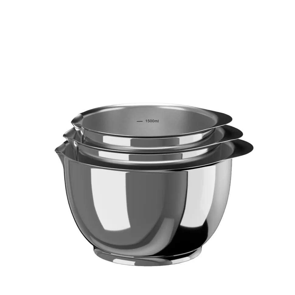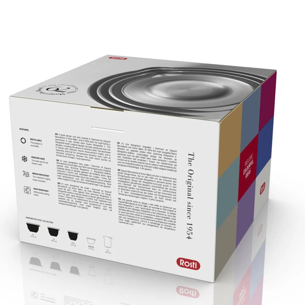 Flot og eksklusivt sæt i stål af den kendte og elskede Margrethe-skål – 1,5 + 2 + 3 liter. Skålen er produceret i 18/8 stål og har satin-finish indvendig og blank finish udvendig. Kan vaskes i opvaskemaskine og bruges i fryser, men ikke i mikroovn. 5 års garanti.