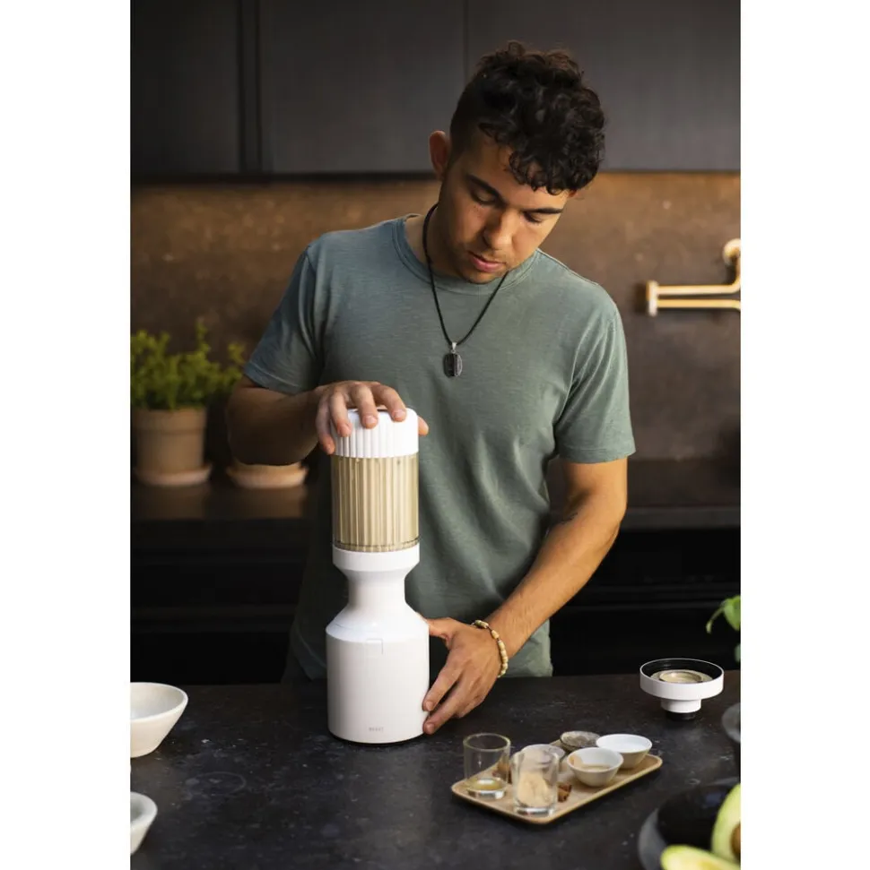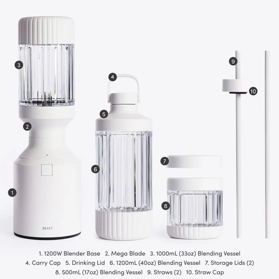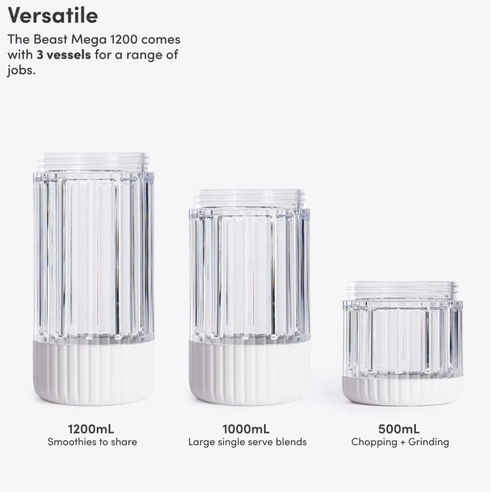 Beast Mega Plus 1200 leveres med tre blenderbeholdere (500, 1000 og 1200 ml), der fungerer som drikkebeholdere, når du sætter drikkelåg og sugerørshætte på og tager dem med dig på farten. Den rillede beholder giver dig et godt greb.