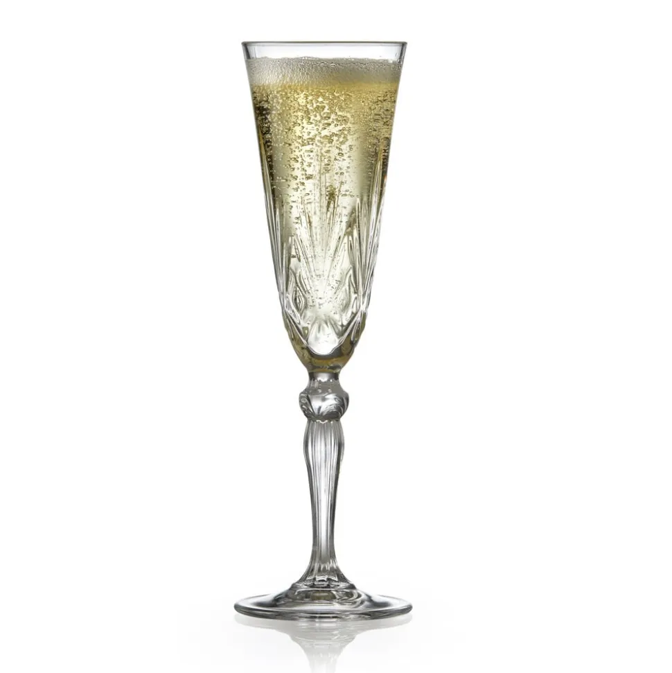 Champagneglasset fremhæver sit perlende indhold på smukkeste vis, når glassets elegante mønster reflekterer omgivelsernes skygger. Tåler opvaskemaskine. 16 cl, højde 22 cm, 4 stk.