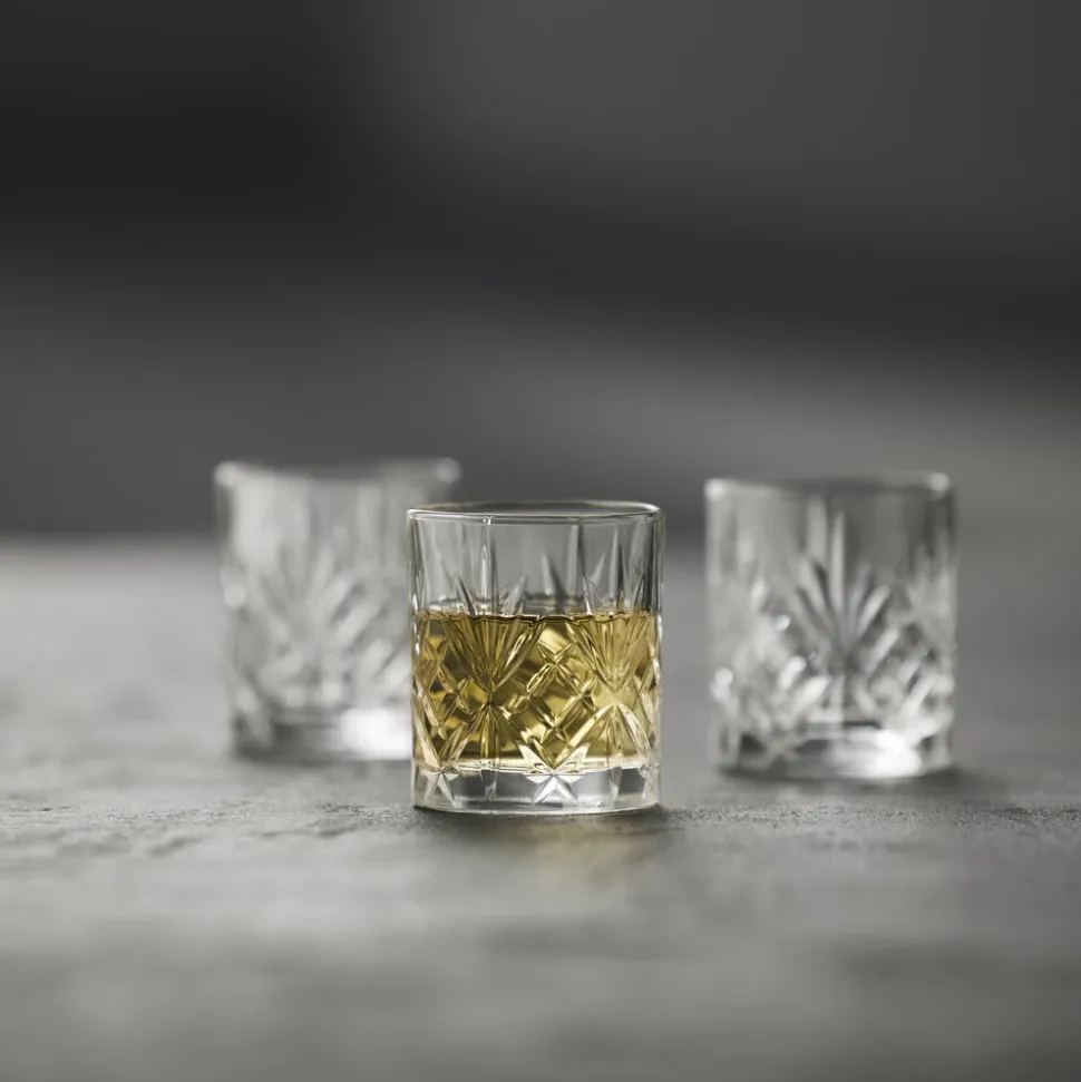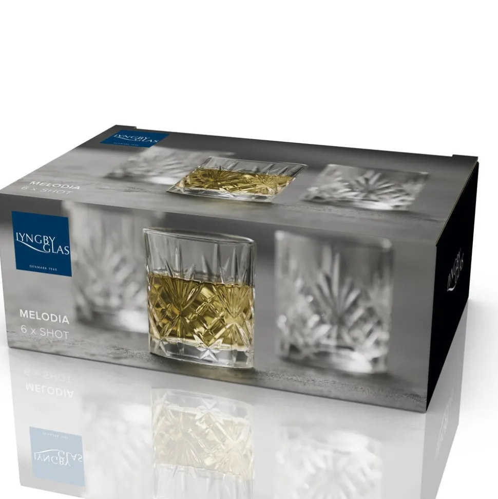 Elegante shotglas som fremhæver indholdets nuancer, når omgivelsernes lys og skygger reflekteres i glassets smukke mønster. De små glas har en størrelse, som passer perfekt til hverdagens supersunde grøntsagsshots, jule- og påskefrokoster eller andre festligheder med snaps og lign. Tåler opvaskemaskine. 8 cl, 6 stk.