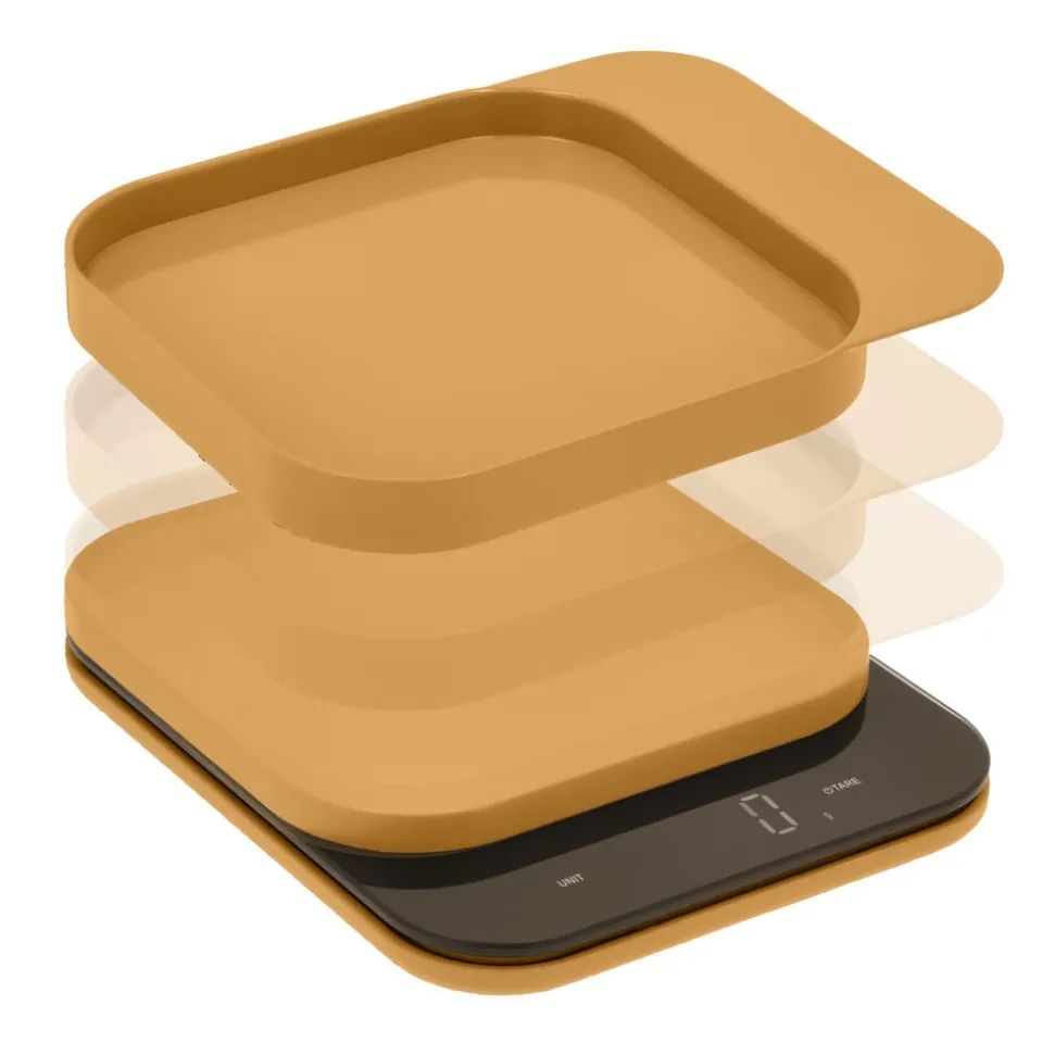 Der kan skiftes mellem flere måleenheder, g, kg, oz, lb, ml, fl oz, og vægten har tarafunktion. Tændes manuelt og slukker automatisk. Fire L-formede silikonefødder i samme farve som vægten er placeret under bunden.