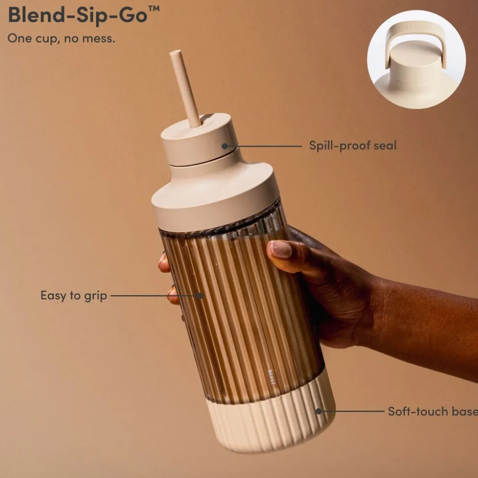 Beast Mighty Plus 850 leveres med tre blenderbeholdere (415, 638 og 786 ml), der fungerer som drikkebeholdere, når du sætter drikkelåg og sugerørshætte på og tager dem med dig på farten. Den rillede beholder giver dig et godt greb.