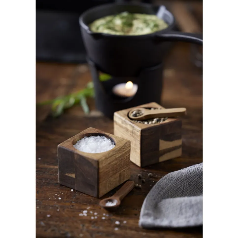 Det lækre miniskålesæt med to firkantede skåle i smukt akacietræ er ideelt til salt, krydderier, dip, nødder og lignende. Der medfølger to fine skeer i akacietræ. Skålene måler 6 x 6 x 5 cm, og skeerne er 7 cm lange.