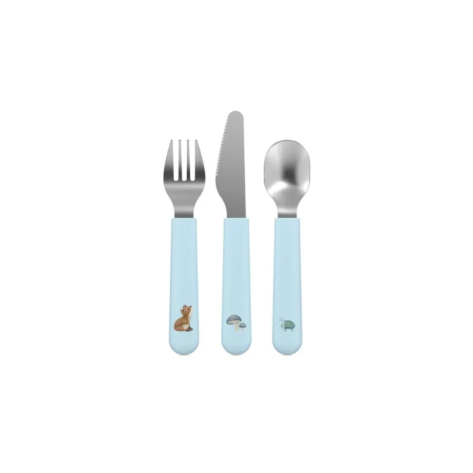 Funktionelt bestiksæt med kniv, gaffel og ske til småbørn, der spiser selv. Rustfrit stål med rundede plasthåndtag, der giver et behageligt greb. Kniven har skærekant på den ene side. Velegnet til opvaskemaskine. Fra 2-3 år. PP og rustfrit stål.