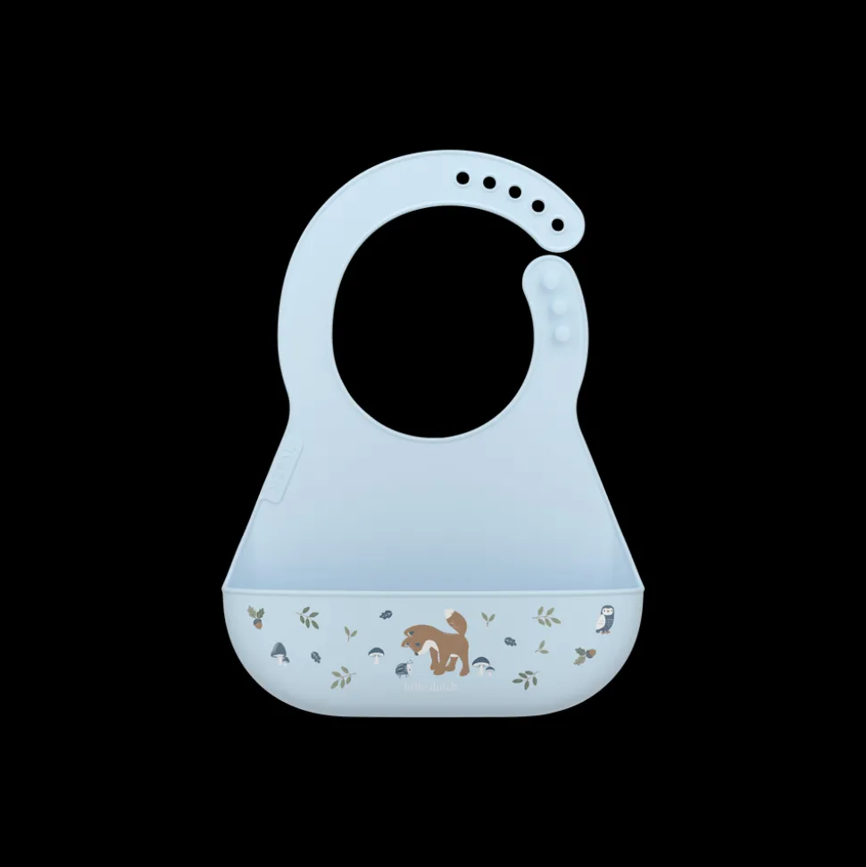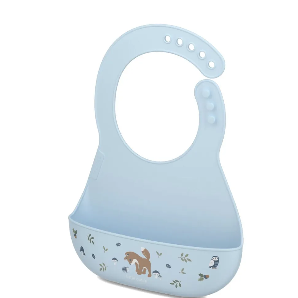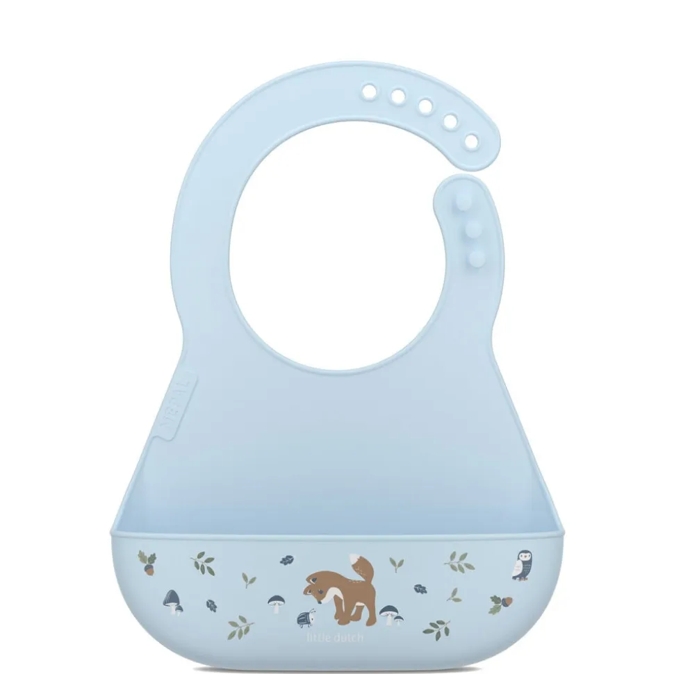 Hagesmæk af blød og fleksibel silikone med en stor lomme foran til at opsamle den mad og væske, der ryger forbi munden. Justerbar halslukning, så hagesmækken kan bruges i lang tid, mens barnet vokser. Hagesmækken kan blot skylles under vandhanen og tørrer hurtigt, og den kan også vaskes i opvaskemaskinen.