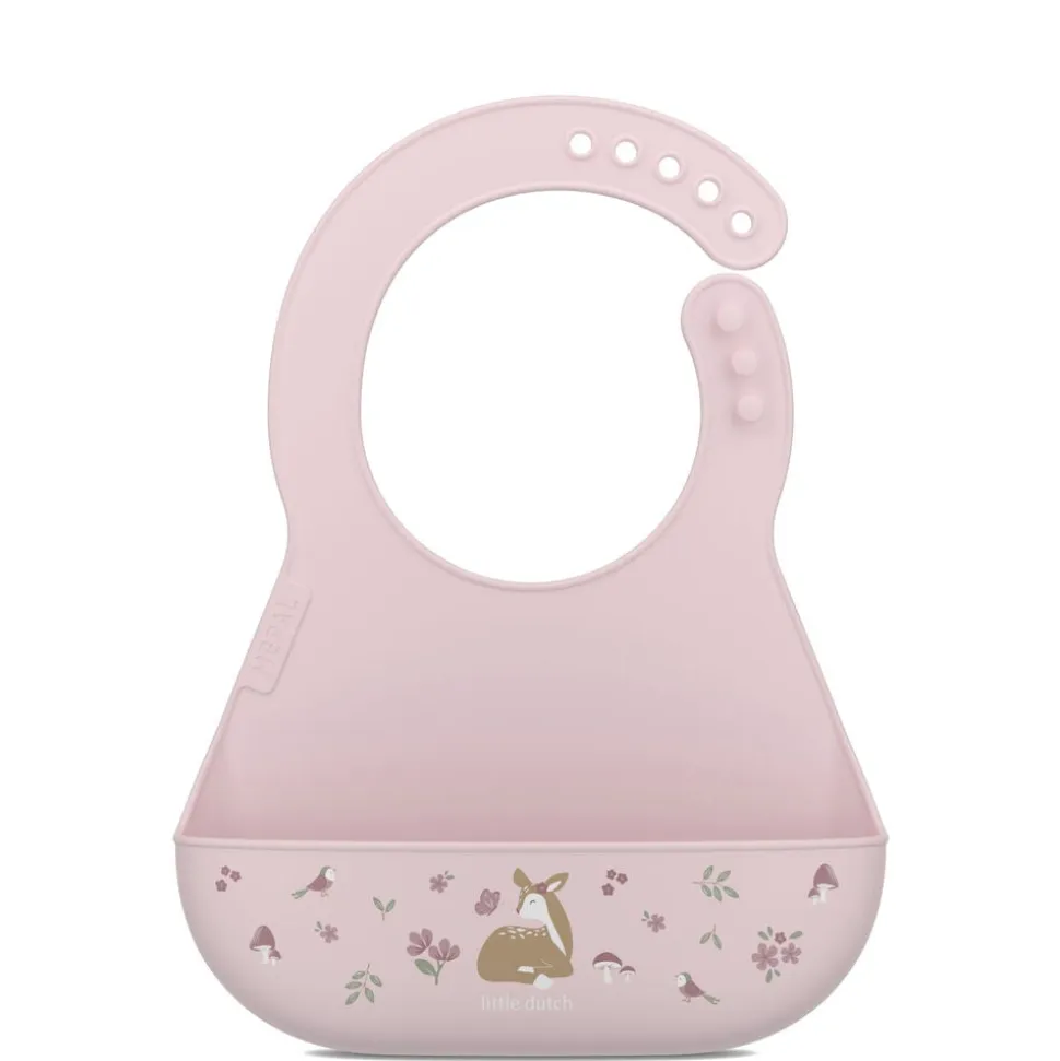 Hagesmæk af blød og fleksibel silikone med en stor lomme foran til at opsamle den mad og væske, der ryger forbi munden. Justerbar halslukning, så hagesmækken kan bruges i lang tid, mens barnet vokser. Hagesmækken kan blot skylles under vandhanen og tørrer hurtigt, og den kan også vaskes i opvaskemaskinen.