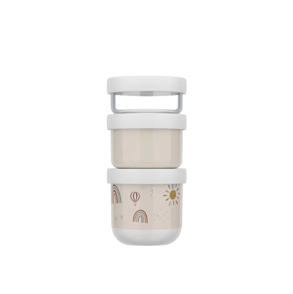 Mio snackboks-tårn består af tre snackbokse i forskellige størrelser, som nemt kan klikkes sammen og tages med på tur. Alle boksene har tætsluttende skruelåg. Den mindste boks er transparent og rummer 100 ml, den mellemste er ensfarvet og rummer 175 ml, mens den største har et karakteristisk Mio-motiv og rummer 275 ml. Alle tre størrelser tåler fryser, og de to største bokse kan også anvendes i mikroovn.