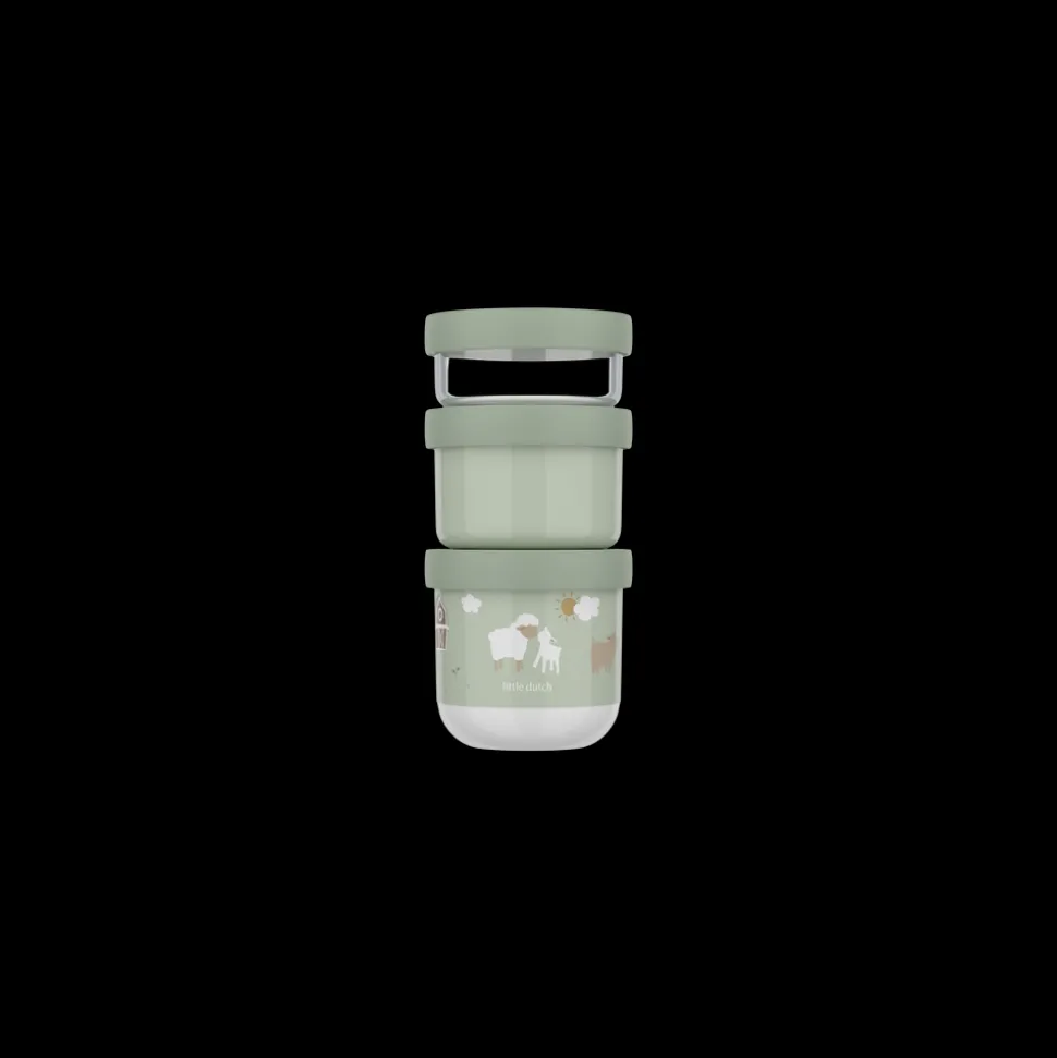 Mio snackboks-tårn består af tre snackbokse i forskellige størrelser, som nemt kan klikkes sammen og tages med på tur. Alle boksene har tætsluttende skruelåg. Den mindste boks er transparent og rummer 100 ml, den mellemste er ensfarvet og rummer 175 ml, mens den største har et karakteristisk Mio-motiv og rummer 275 ml. Alle tre størrelser tåler fryser, og de to største bokse kan også anvendes i mikroovn.