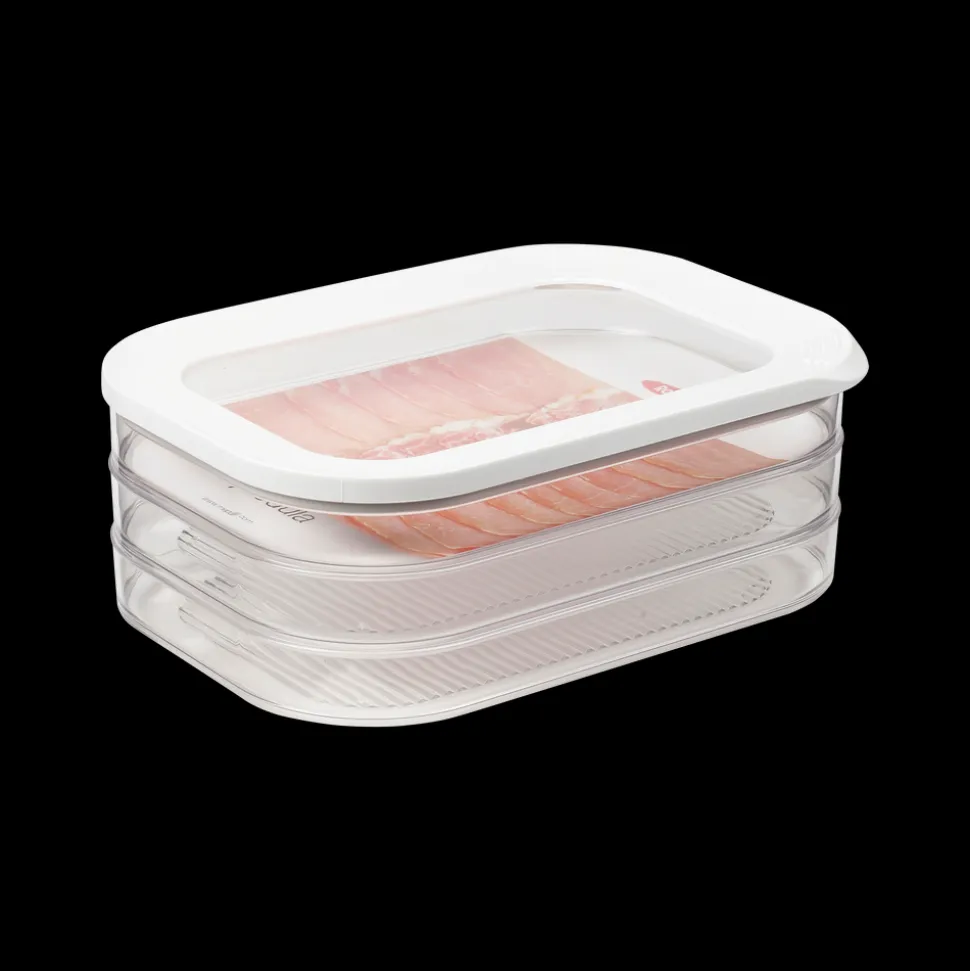 Modula opbevaringsboks med enkel, hvid kant på låget. Både bokse og låg er gennemsigtige, hvilket gør det nemt at overskue indholdet. 3 x 550 ml. Mål: 22,5 x 16 x 8 cm. Boksene er fremstillet af SAN-plast, som er robust og modstandsdygtig overfor ridser. Velegnet til opvaskemaskine men ikke til mikroovn og fryser.