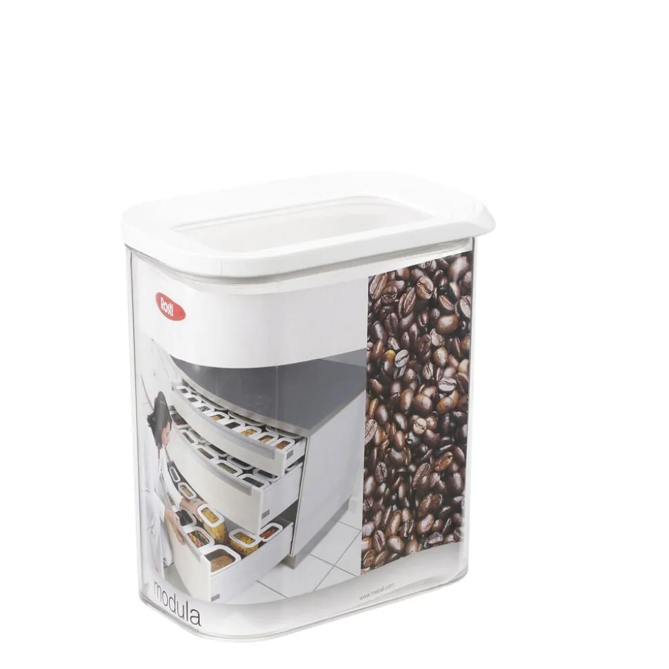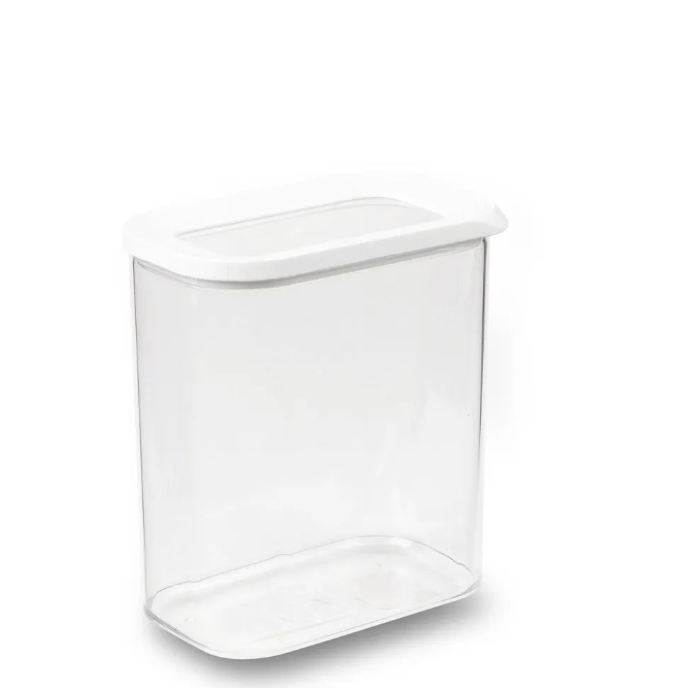 Modula opbevaringsboks med enkel, hvid kant på låget. Både boks og låg er gennemsigtige, hvilket gør det nemt at overskue indholdet. Mål: 14,5 x 9 x 16,5 cm. Boksen er fremstillet af SAN-plast, som er robust og modstandsdygtig overfor ridser. Velegnet til opvaskemaskine men ikke til mikroovn og fryser.