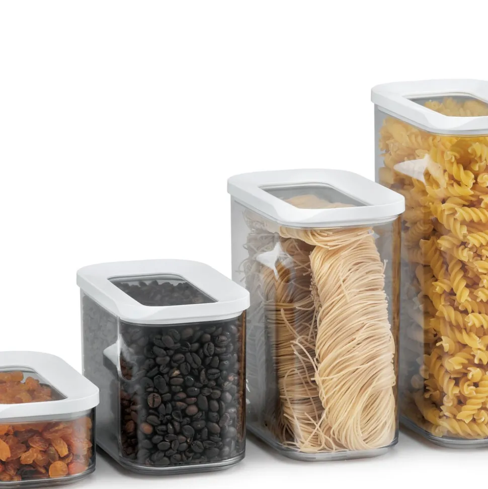 Modula opbevaringsboks med enkel, hvid kant på låget. Både boks og låg er gennemsigtige, hvilket gør det nemt at overskue indholdet. Mål: 14,5 x 9 x 5,5 cm. Boksen er fremstillet af SAN-plast, som er robust og modstandsdygtig overfor ridser. Velegnet til opvaskemaskine men ikke til mikroovn og fryser.