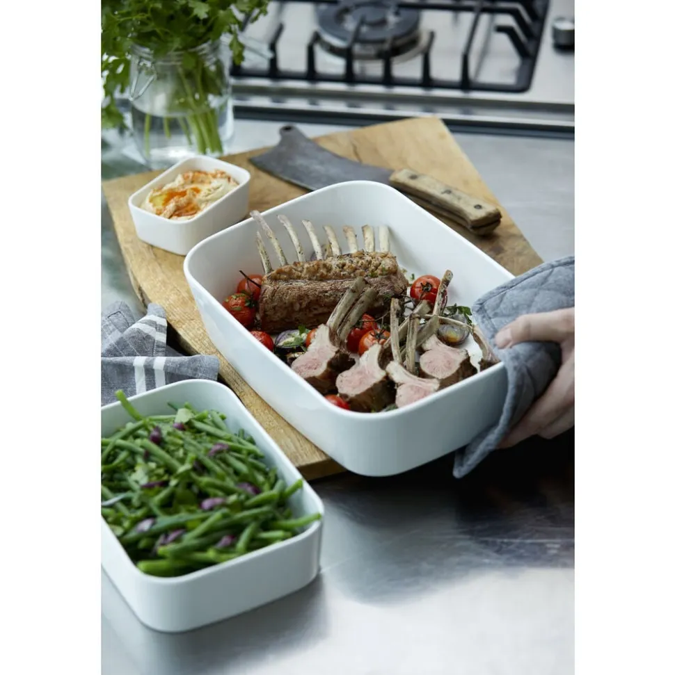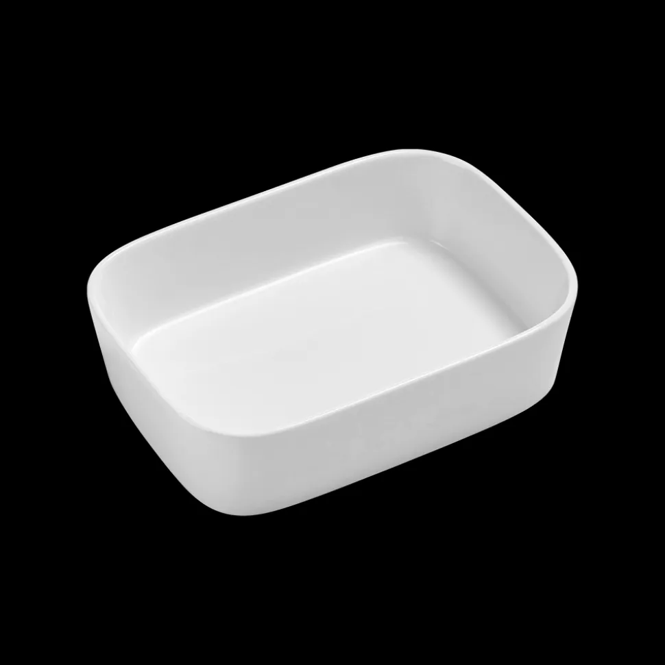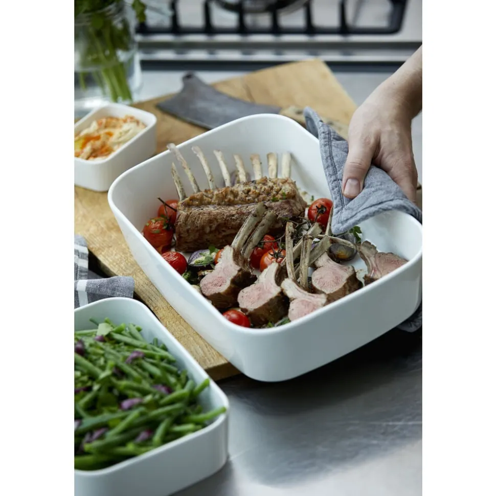 Ovnfast fad i hvidt porcelæn til det skandinaviske køkken. Fadet er fremstillet i forstærket porcelæn, der kan tåle ovntemperatur helt op til 350 grader. Den høje kant og praktiske form giver mange anvendelsesmuligheder. 25 x 18 x 6,5 cm.