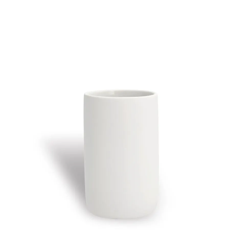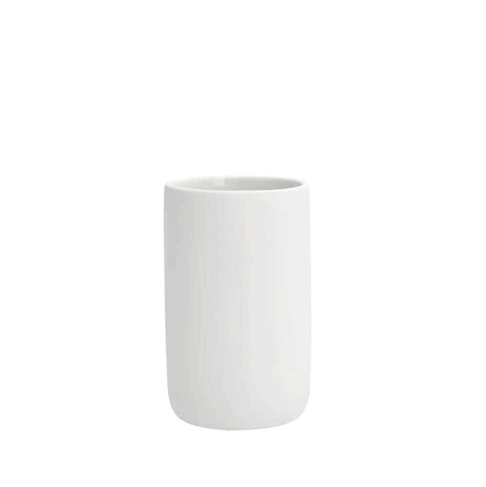 Södahls matte badserie har soft rubbercoating all over, også på sæbedispensertud og toiletbørsteskaft. Kruset er med lækker blank glasur indvendigt.