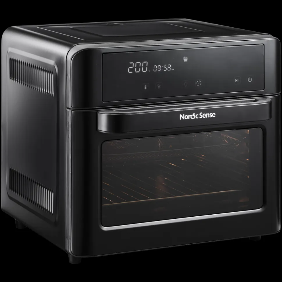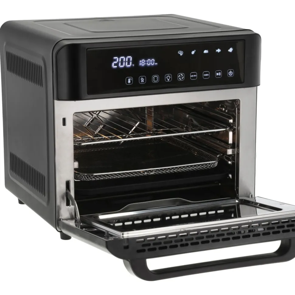 Multiovn med en kapacitet på 25 liter – gør det nemt at bage, stege og grille. Ovnen fungerer samtidig som en klassisk airfryer, hvor varm luft sørger for sprøde resultater med mindre fedt. Den rummelige ovn gør det nemt at tilberede hele måltider som lasagne og andre ovnretter i fad – noget, der ikke altid er muligt i en traditionel airfryer. Med det medfølgende rotisserisæt får du en ekstra funktion i spil – perfekt til en hel kylling eller andre stege. Temperaturen kan justeres fra 30 til 220 °C, og med en 60-minutters timer og automatisk sluk er det let at holde styr på tilberedningstiden. Der medfølger alt det nødvendige tilbehør: rist, bageplade, krummebakke og løftegaffel.