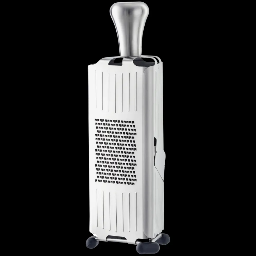 Kompakt multirivejern til at rive og snitte alt hvad, du kan tænke dig og som samtidig er let at gemme væk i skuffen. Multirivejernet kombinerer fint, groft samt snittejern i et køkkenredskab til mange formål, fx at rive parmesan, rive kartofler samt at snitte gulerødder m.m. Skæreoverfladen kan fjernes for rengøring. Silikone-fødderne sikrer, at du kan arbejde uden at rivejernet rykker sig på bordet. Inklusiv beskyttende etui.