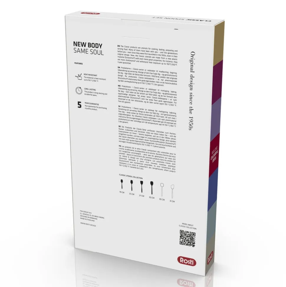 Rosti-sortimentet indeholder et væld af redskaber i forskellige størrelser, udformninger og farver. De fås i de samme farver som Margrethe-skålene, så det er altid muligt at matche skåle og redskaber eller alternativt lave sin egen spændende farvekombination. Classic-produkterne produceres i Durostima®, et langtidsholdbart plastmateriale med mange gode egenskaber, f.eks. er de mere brudsikre og tåler kortvarig varmepåvirkning op til 150 °C. Vi anbefaler, at redskabet altid fjernes fra panden eller gryden, når det ikke er i brug. Velegnet til opvaskemaskine. 5 års garanti.