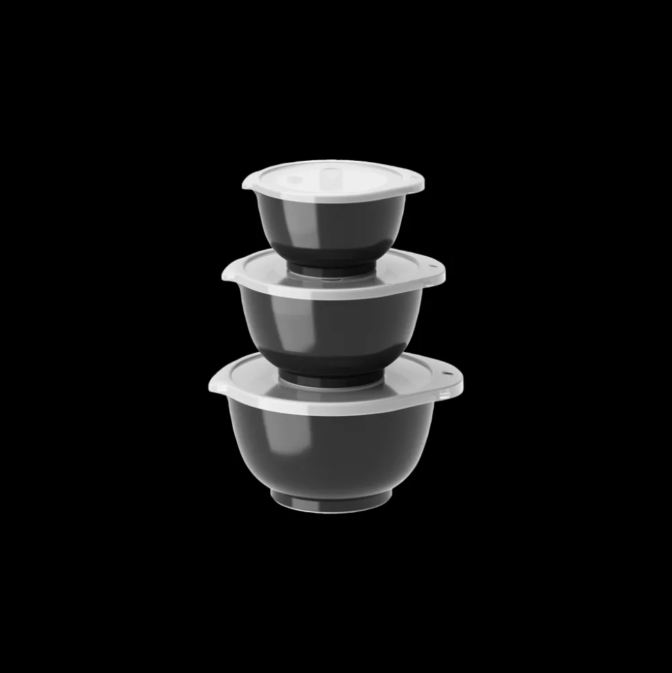 Margrethe miniskålesæt fra Rosti. Sættet indeholder 0,25 + 0,5 + 0,75 liter Margrethe-skåle med tilhørende låg.