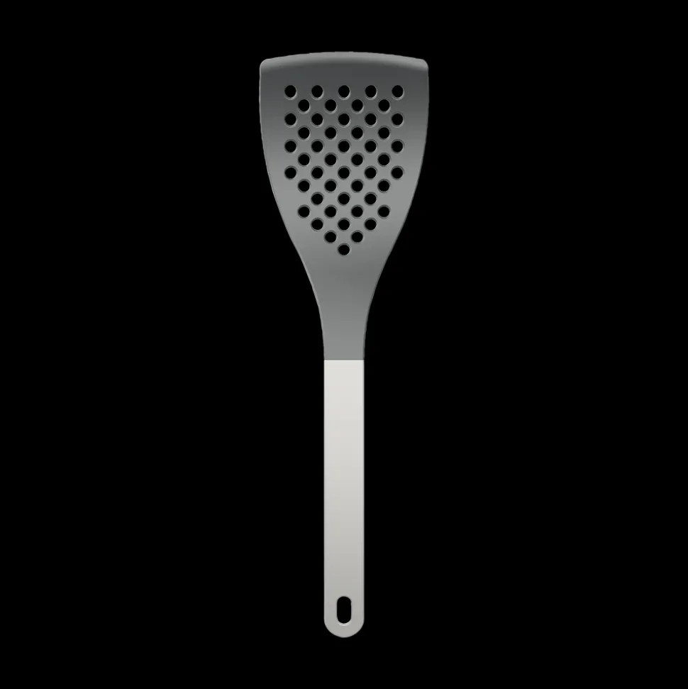 Stor palet med farvet skaft. 31 cm. Bladet er perforeret, og med en bredde på 8,5 cm er paletten velegnet til at håndtere større fødevarer på panden, såvel kød som grøntsager. Fremstillet i nylon, der er skånsomt mod gryder og pander med belægning og tåler varme op til 220 grader C. Slankt og ergonomisk design med praktisk ophængshul. Velegnet til opvaskemaskine.