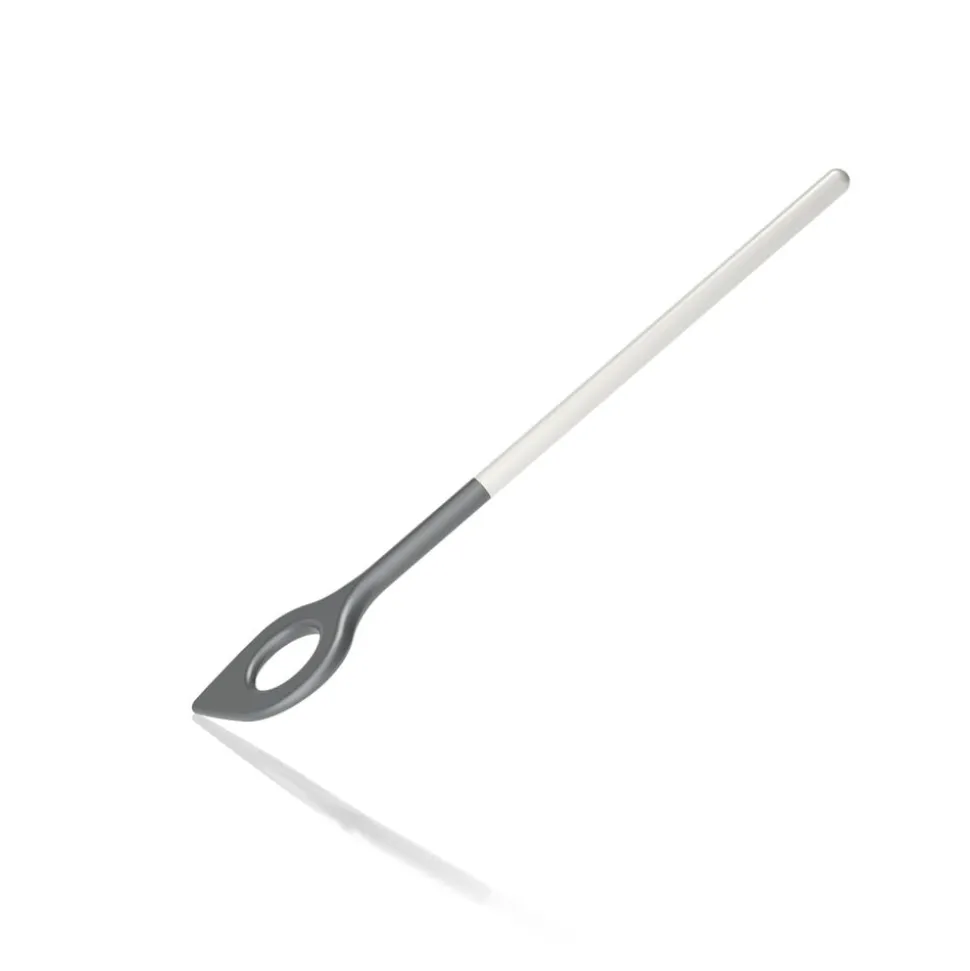 Røreske med hul og farvet skaft. 31 cm. Skeens hoved har en diameter på 5,5 mm, og spidsen i den ene side gør det nemmere at røre helt ind i kanten af grydens bund. Hullet i skeen gør den velegnet til fremstilling af bl.a. fars og dej og til at røre i ris. Fremstillet i nylon, der er skånsomt mod gryder og pander med belægning og tåler varme op til 220 grader C. Velegnet til opvaskemaskine.