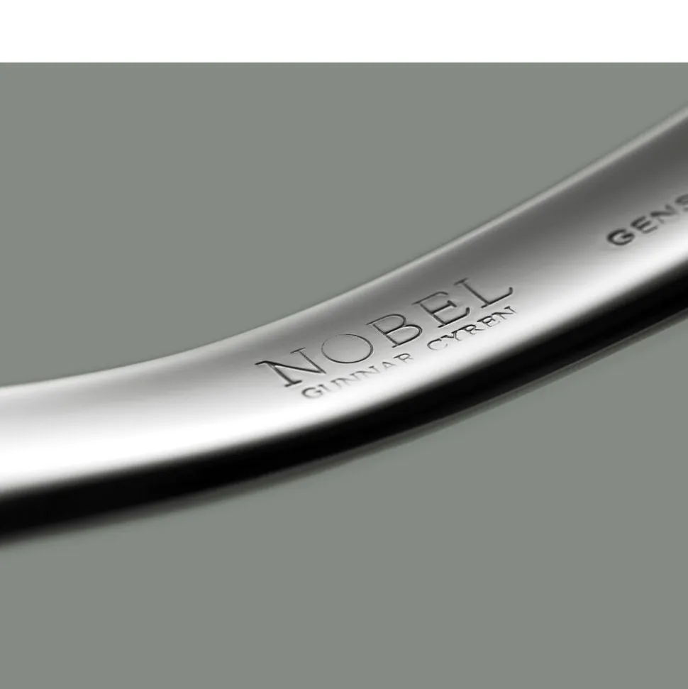 Nobel blev skabt af Gunnar Cyrén til Nobelprisudelingens 90-års jubilæum og er allerede blevet en klassiker. Bestikket er inspireret af begyndelsen af 1800-tallet og Karl XIV Johans sølvbestik. Et bestik, der er umiskendeligt svensk, men med nye detaljer, der overrasker. Nobel tilføjer det ekstra – uanset om du vælger at dække op helt traditionelt med hvide duge og kandelabre, eller moderne og trendy med nye materialer og borddekorationer. Nobel er fremstillet af rustfrit stål med let børstet skaft og højglanspoleret hoved, og det bruges stadig ved den årlige uddeling af Nobelprisen i Stockholm. Tåler opvaskemaskine.