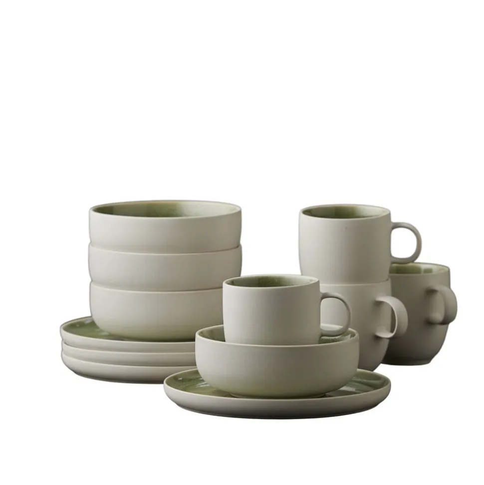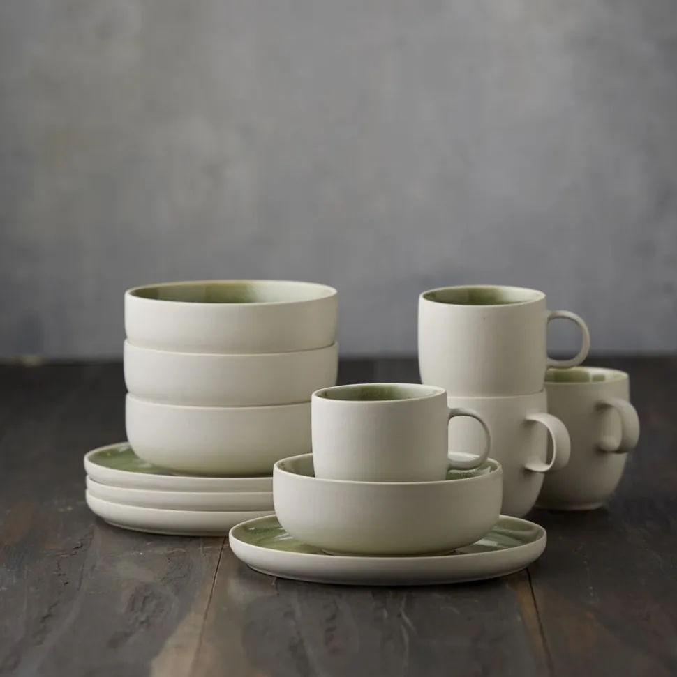 Grundfarven er mat hvid, og produkternes inderside har fået den smukke grønne farve Moss, her i den blanke variant. Grøn er naturens farve, der signalerer friskhed, håb og udvikling. Grønt er godt for øjnene, siger vi, og netop derfor er de grønne nuancer populære i boligindretningen. Grønne farver giver helt naturligt associationer til den ro, man finder i skoven eller ved at se ud over en stor, grøn mark. Sæt Moss sammen med helt lys beige, med brun og andre farver fra naturen og kombiner med teaktræsmøbler og andre træsorter med gylden glød.