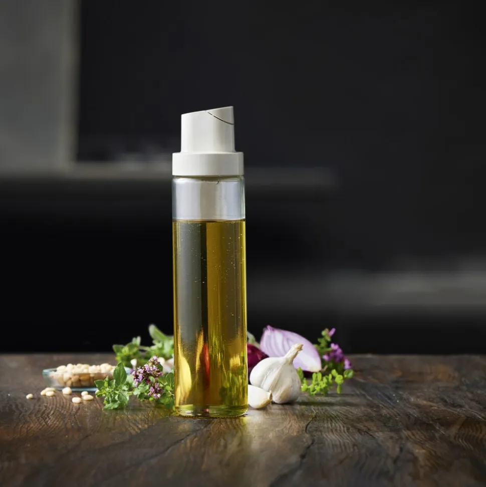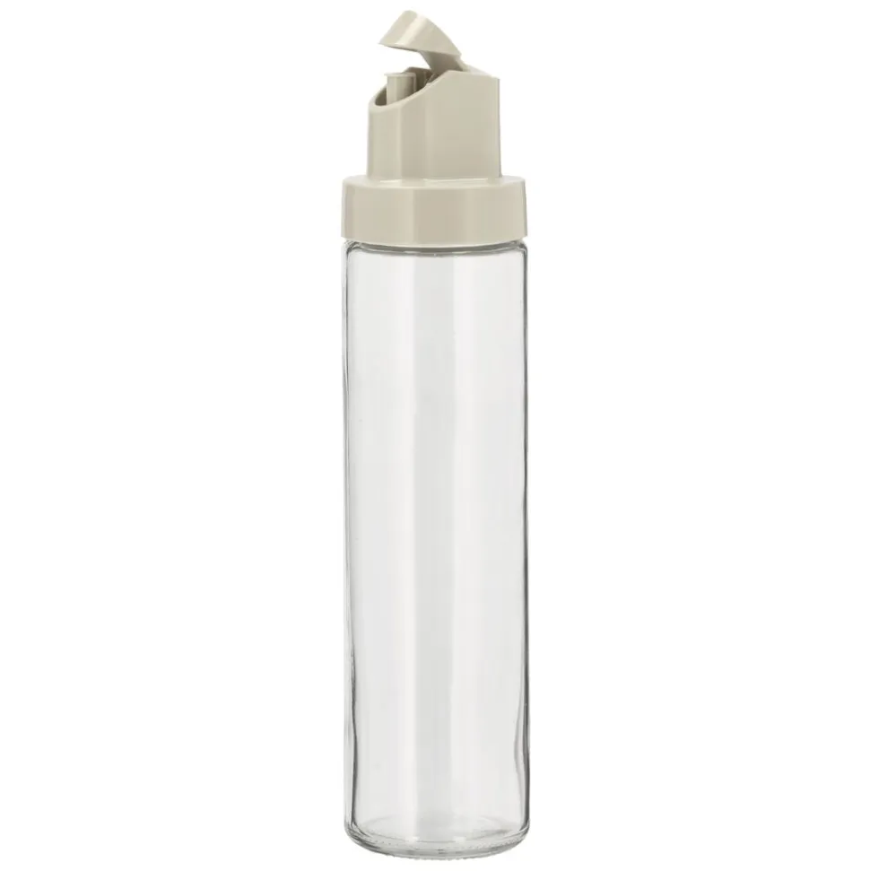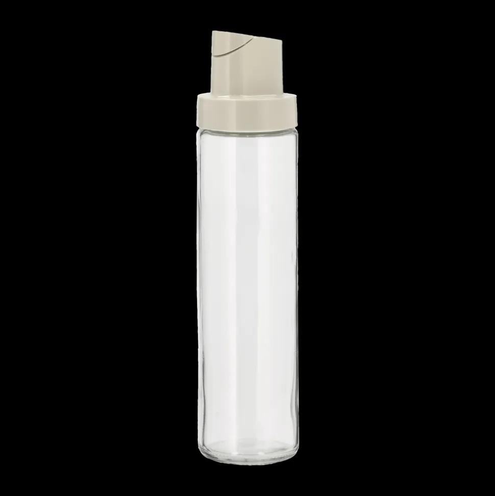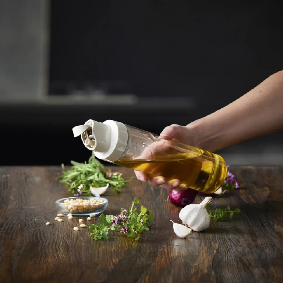 Glasflaske med dispenserlåg til olie, eddike og lignende. Betjenes med én hånd, idet låget automatisk åbner, når flasken holdes vandret, og lukker igen, når flasken vippes tilbage i lodret position.
