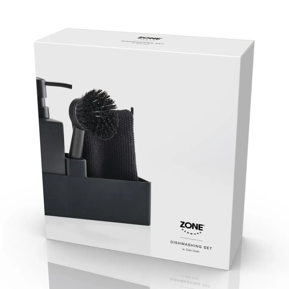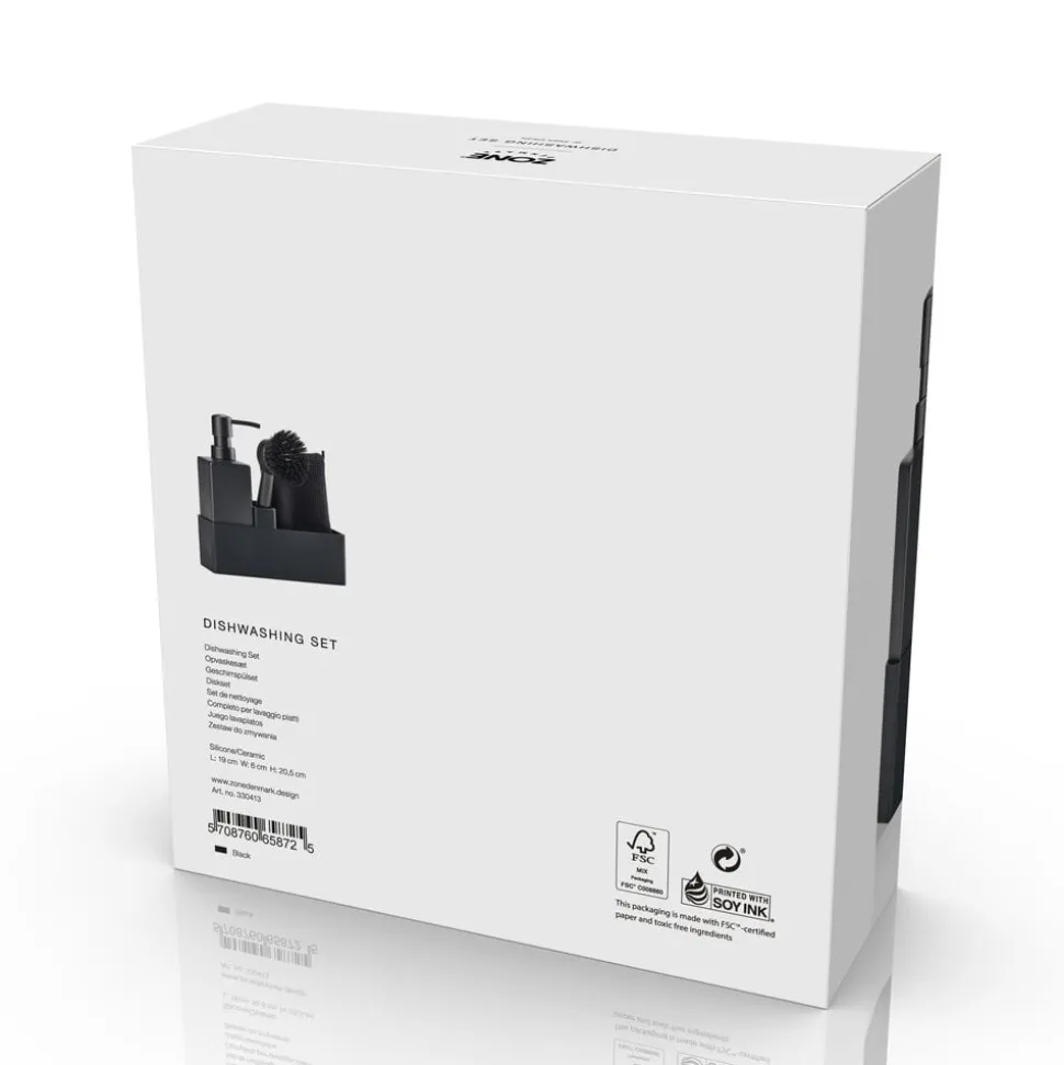 Zones populære alt-i-ét opvaskesæt med karklud. Sæbedispenseren er fremstillet i solid keramik, og opbevaringsdelen er i ridsefri og rengøringsvenlig silikone. Børsten kan stå selv, og børstehovedet kan udskiftes, så du altid har en frisk børste.