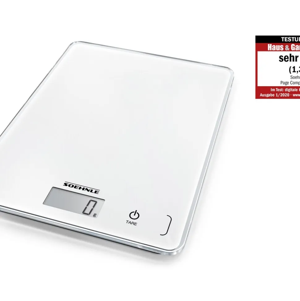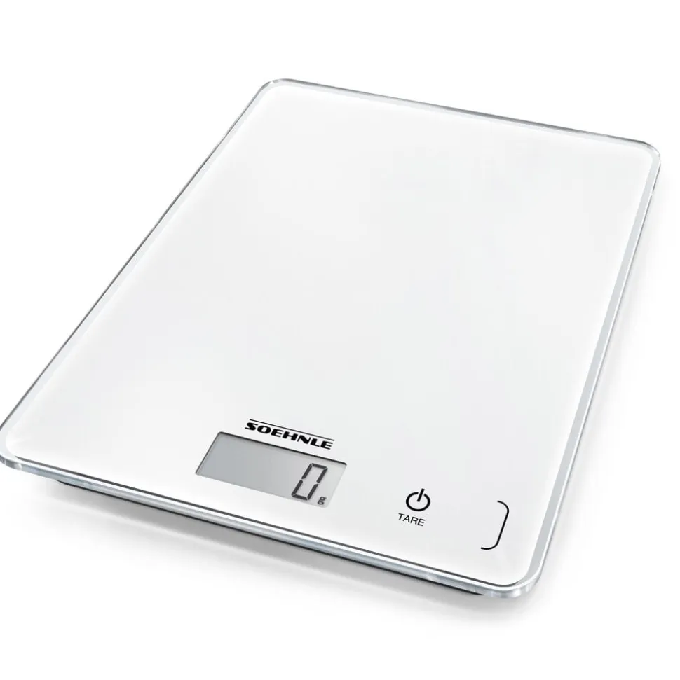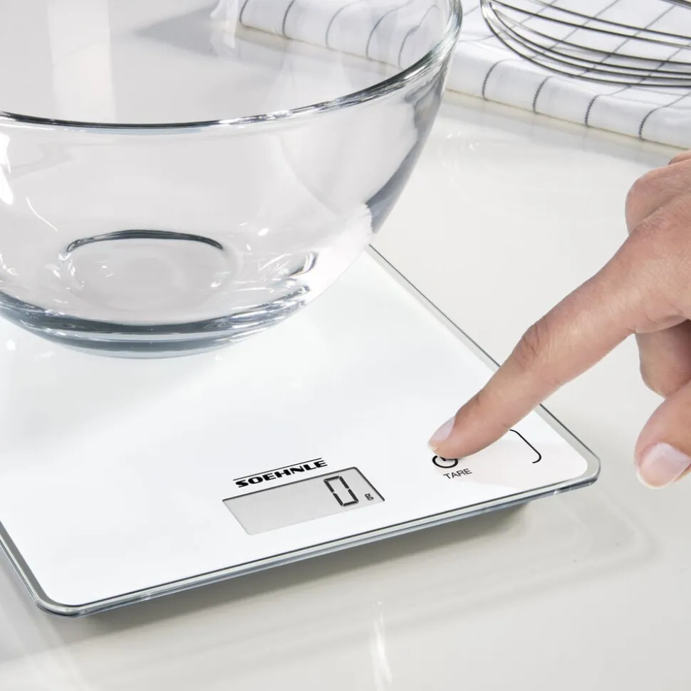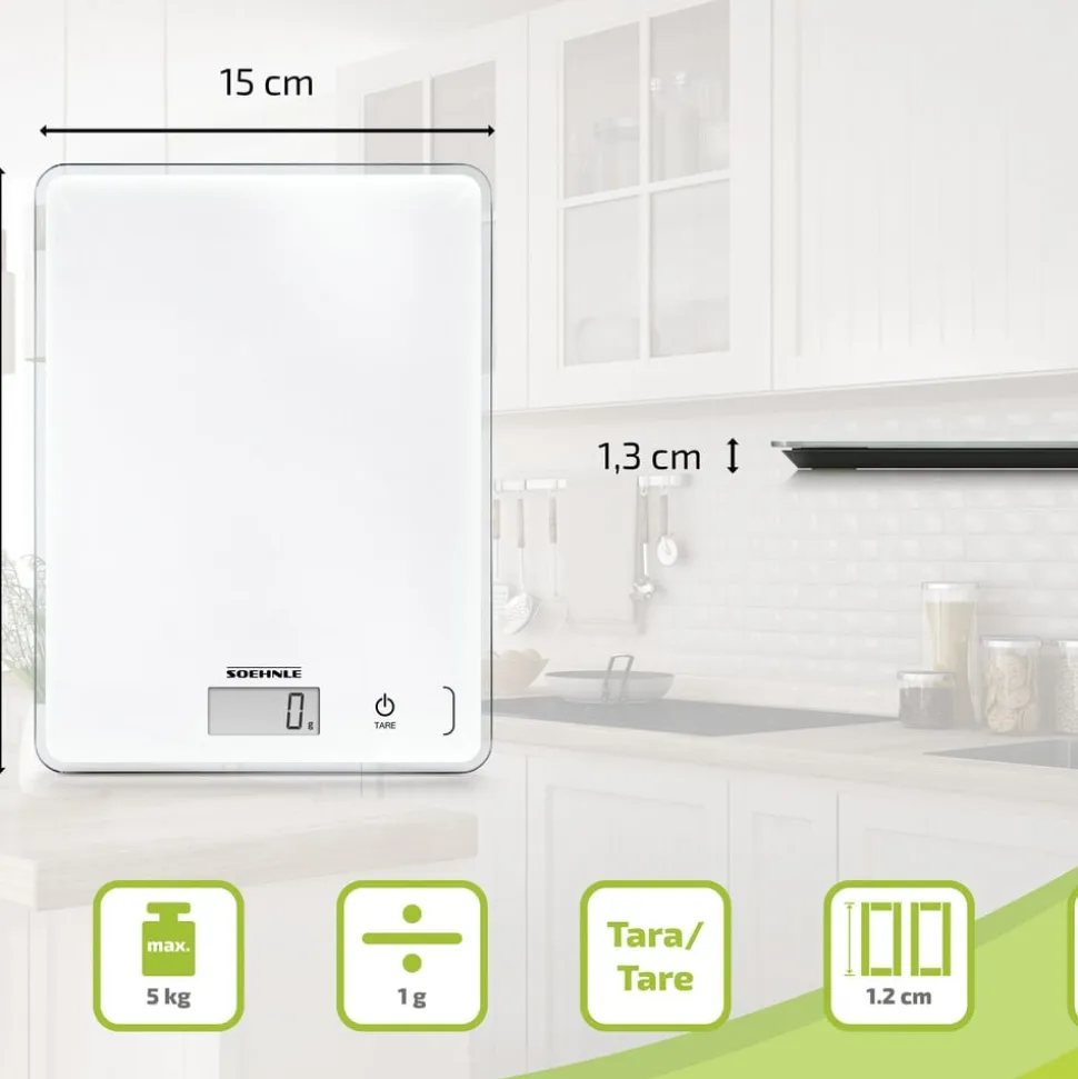 Køkkenvægt i kompakt og ekstra tyndt design, 20 x 15 x 1,3 cm. Vejer op til 5 kg med interval på 1 g, hvilket gør den ideel til fx krydderier. Letlæseligt display, tarafunktion og energisparende autosluk-funktion. Enhederne vises i g/kg eller oz/lb.